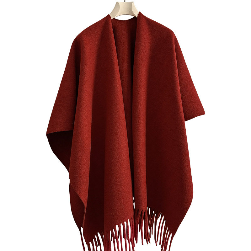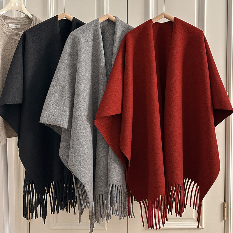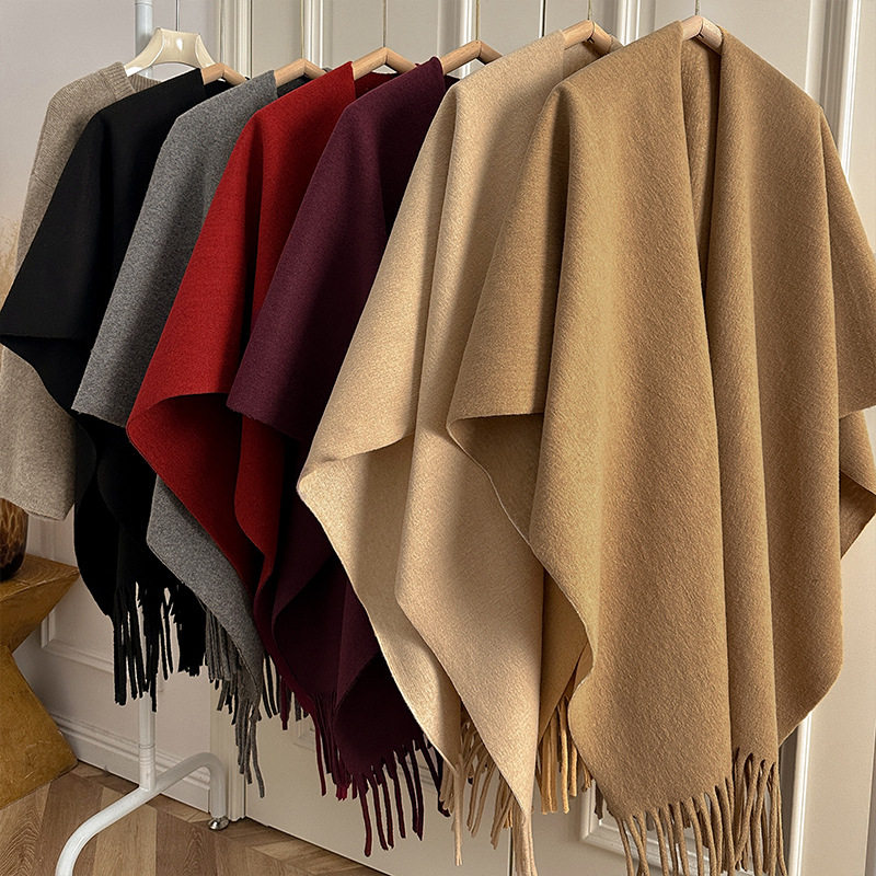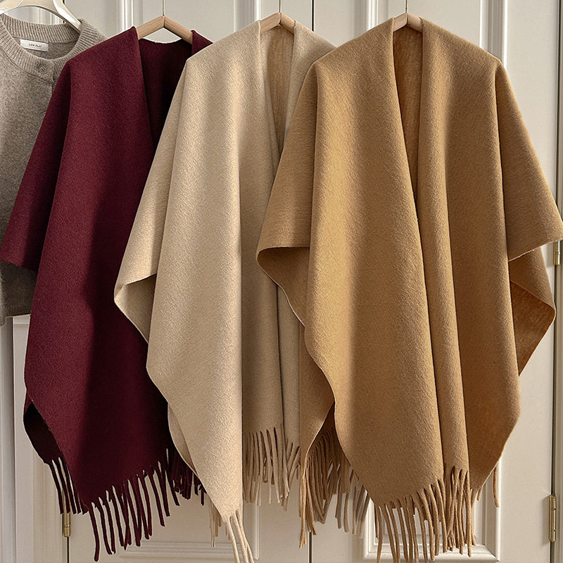 旅游保暖毛尼流苏开衩披肩女秋冬加厚斗篷外套旅游拍照露思披肩风