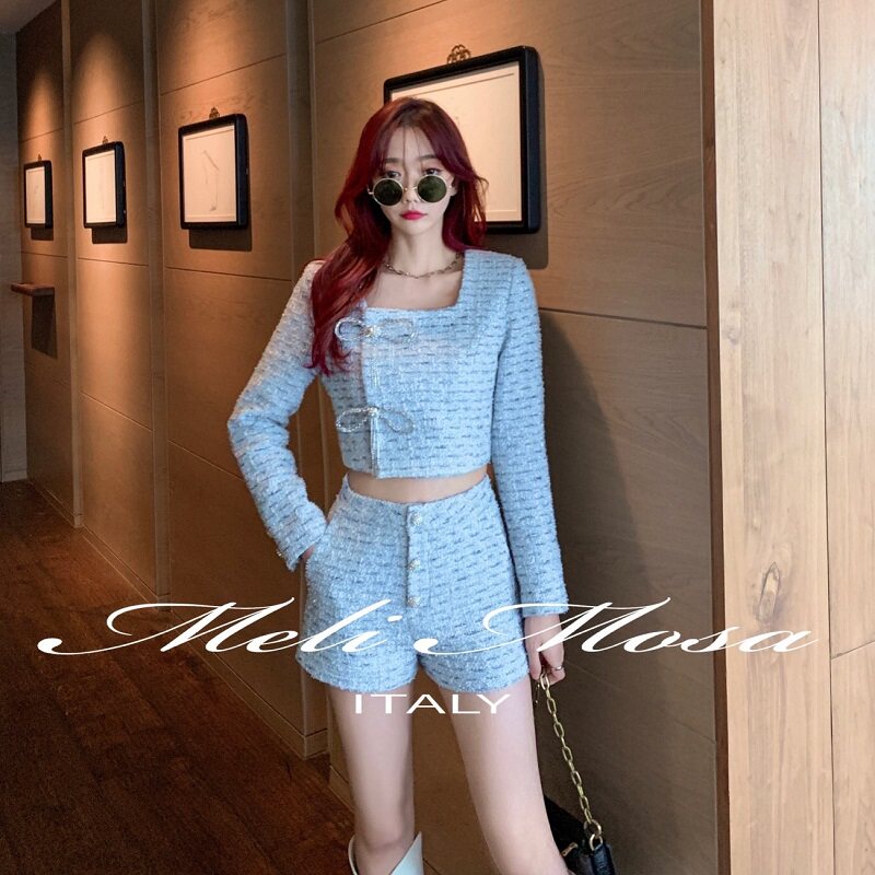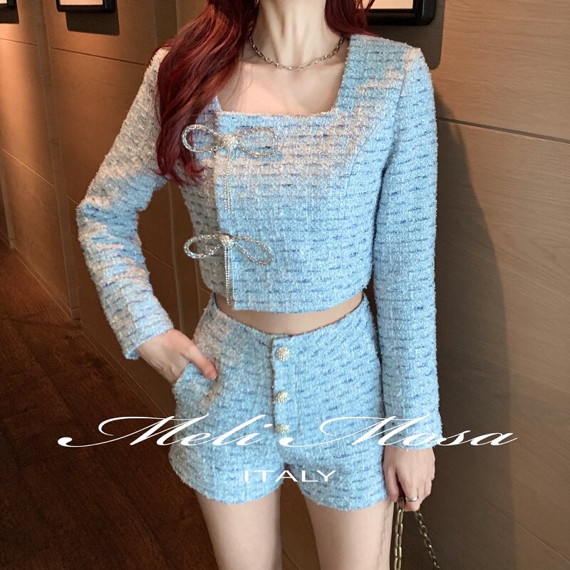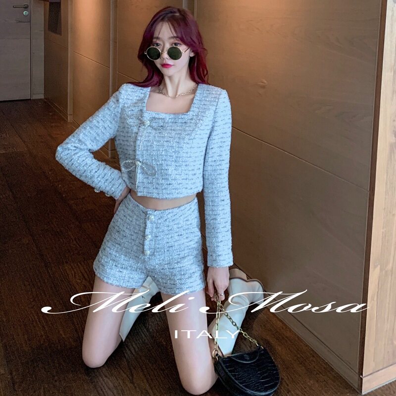【折】MeliMosa新款蝴蝶结花呢外套钻扣短裤小香风套装