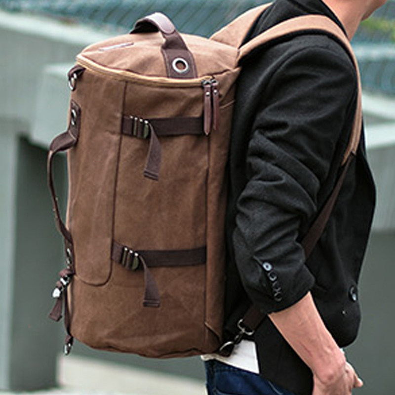 新款双肩包男韩版户外旅行背包帆布男士休闲大容量圆桶包学生书包