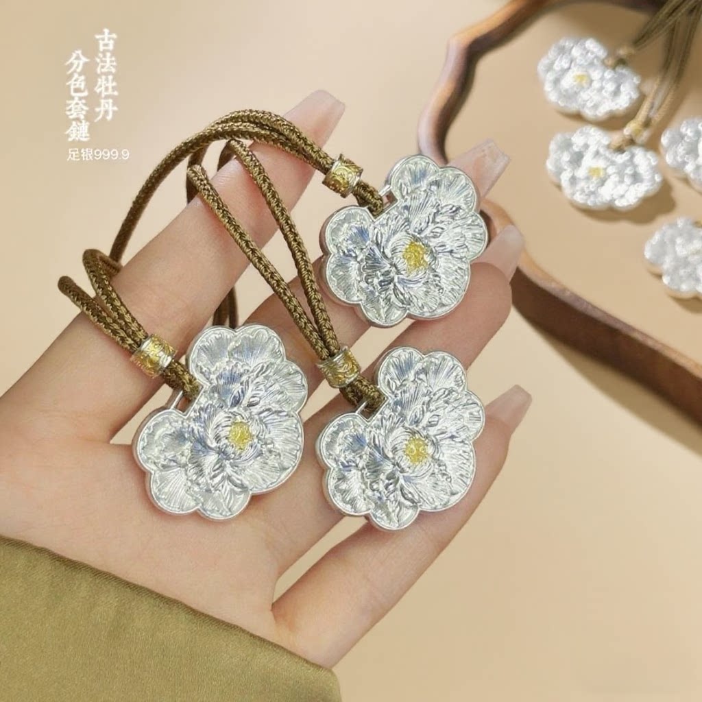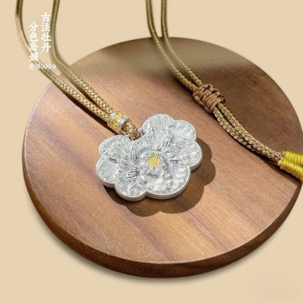 实心牡丹花足银9999古法纯银吊坠简约精致浮雕银饰项链送女友礼物