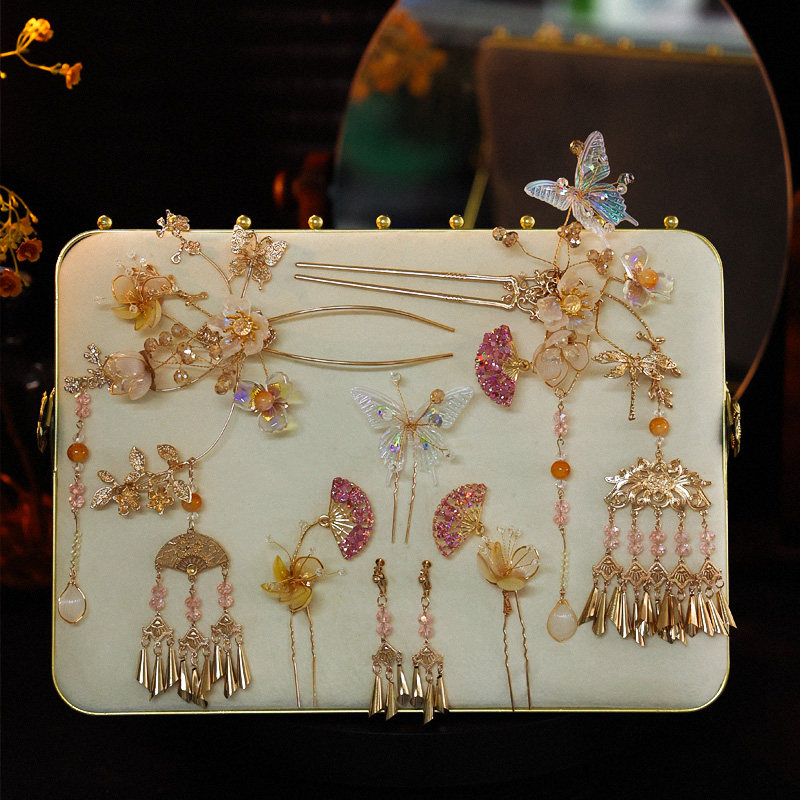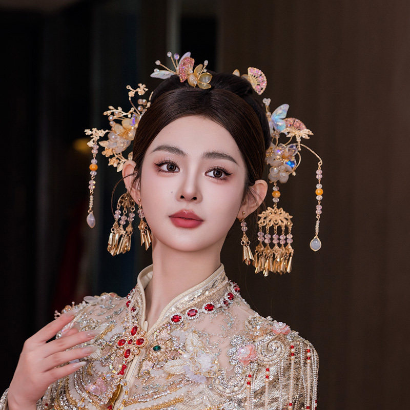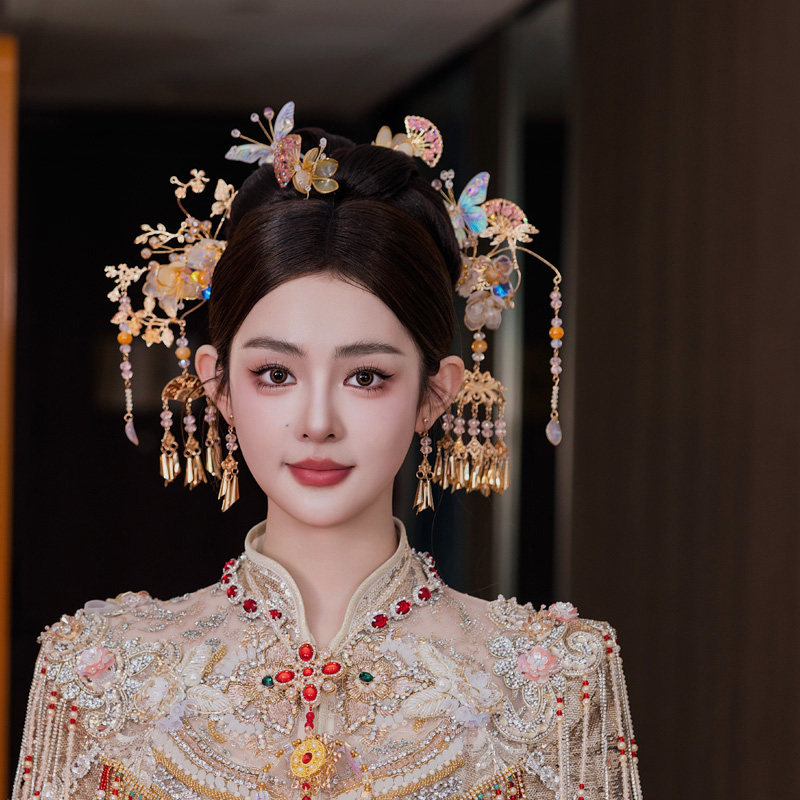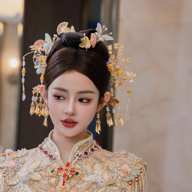 新娘头饰中式古风金色流苏响铃秀禾发饰浅色减龄古典系结婚配饰品