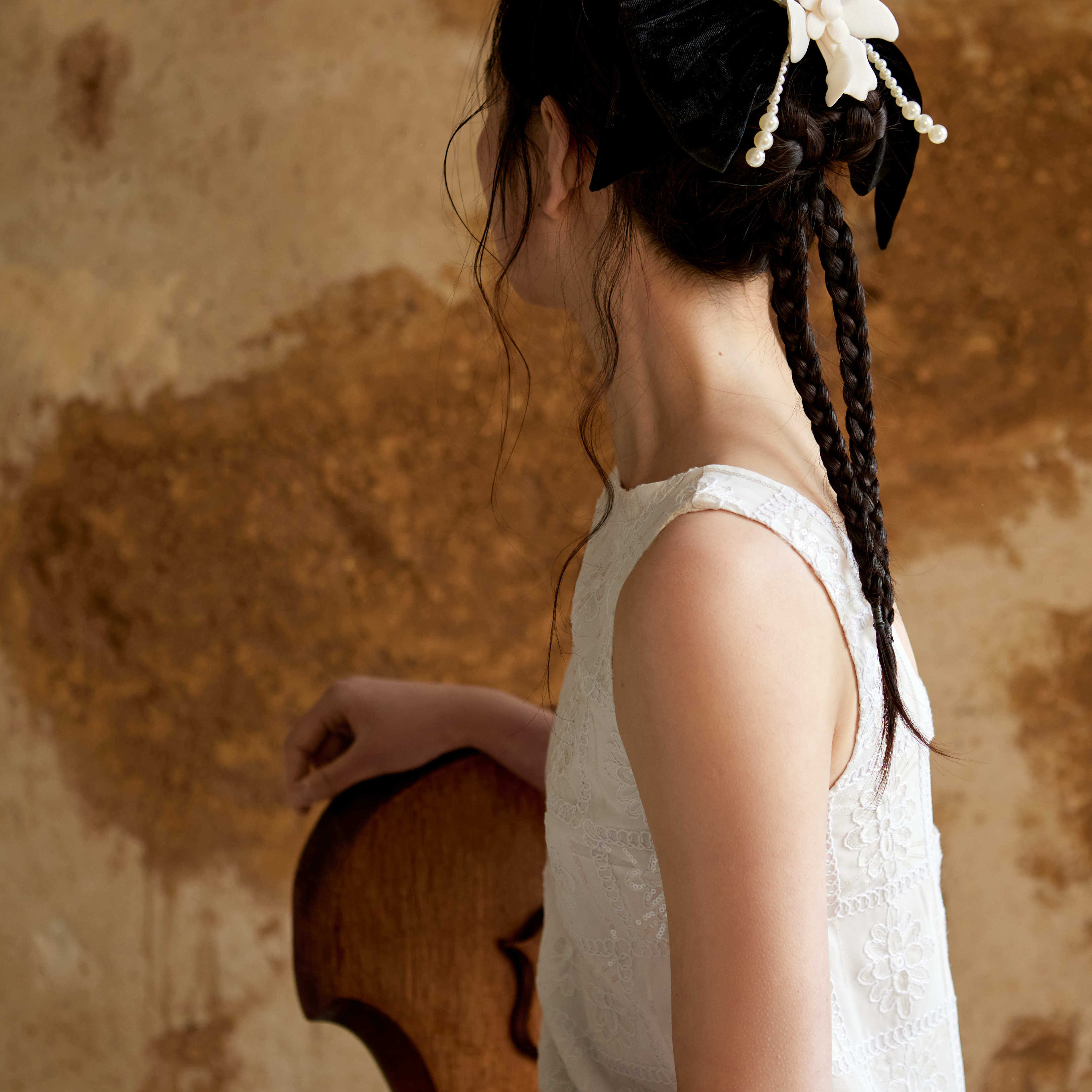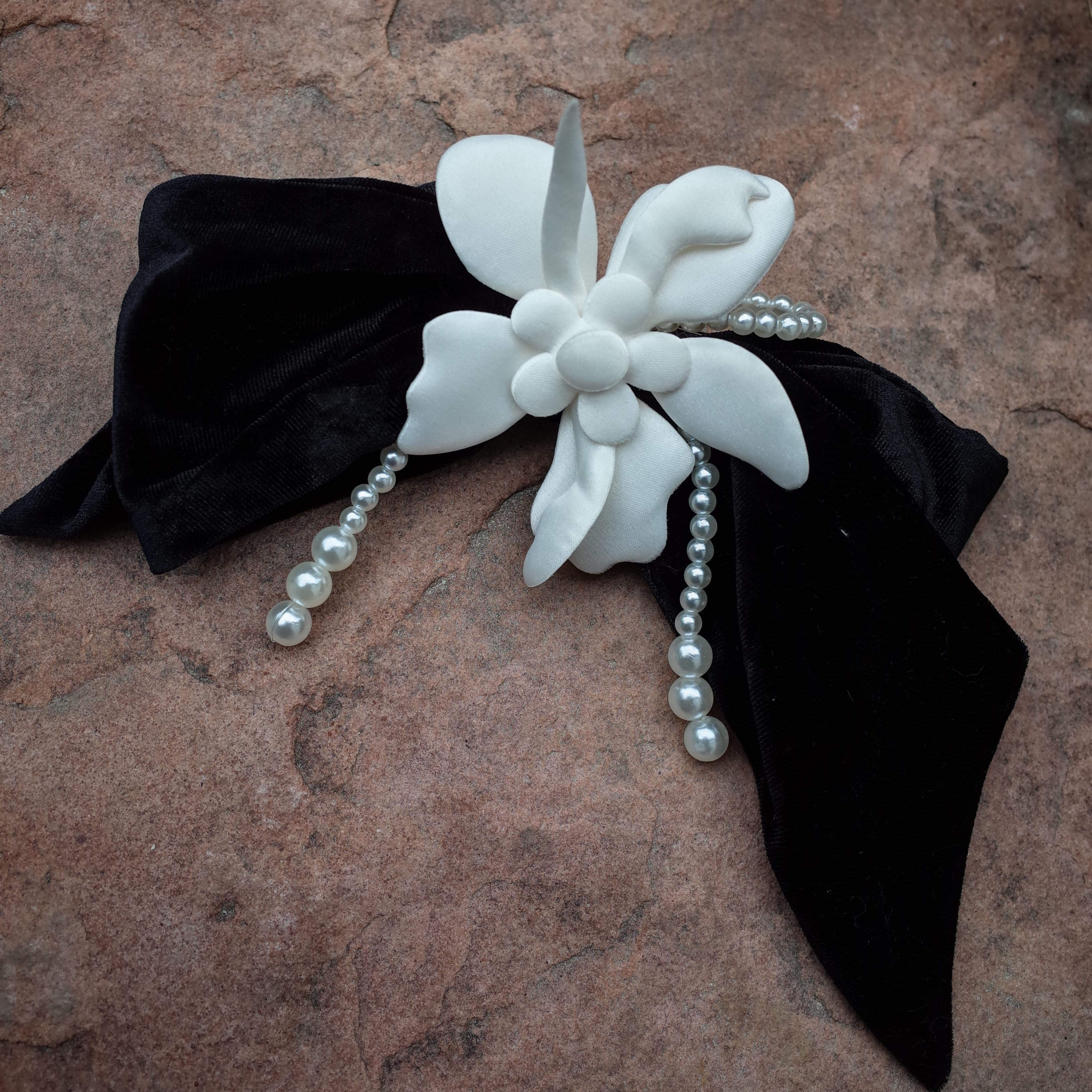 Shiitake 珍珠小花蝴蝶结丝绒发夹