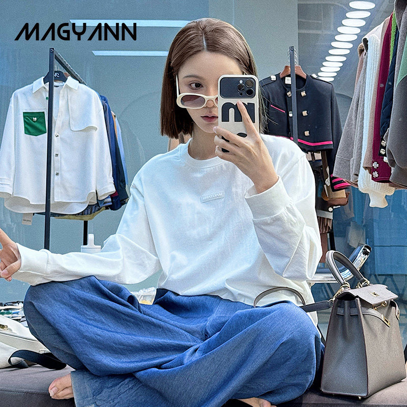 Magyann设计师原创纯色胸前贴标圆领简约T长袖宽松舒适通勤T恤女
