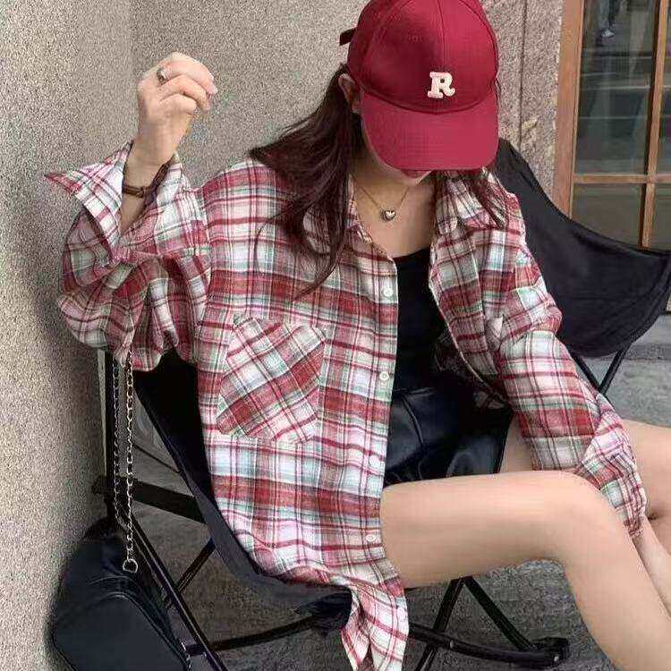 【新款】韩版hiphop撞色格子长袖衬衫宽松慵懒风百搭外套dg