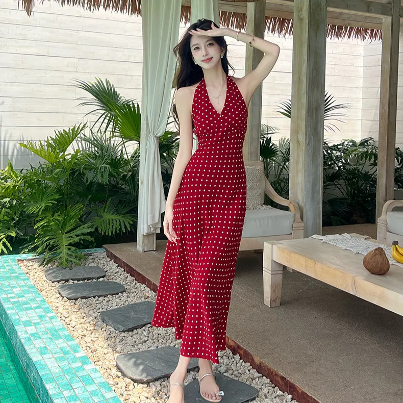 2026夏季新款法式复古甜心V领红色波点裙子挂脖连衣裙绑带背心裙
