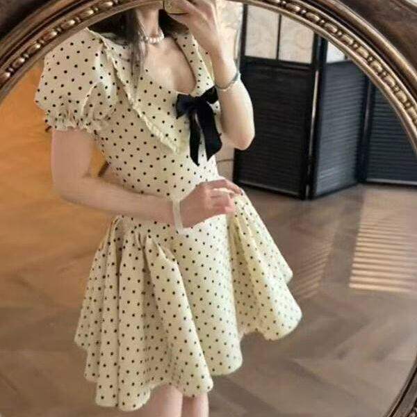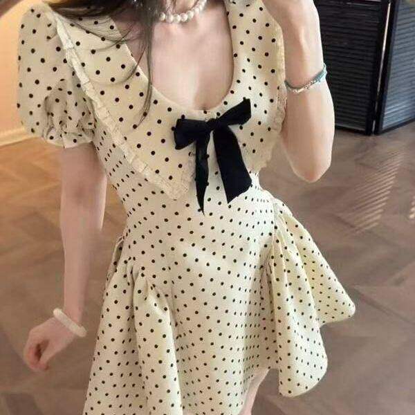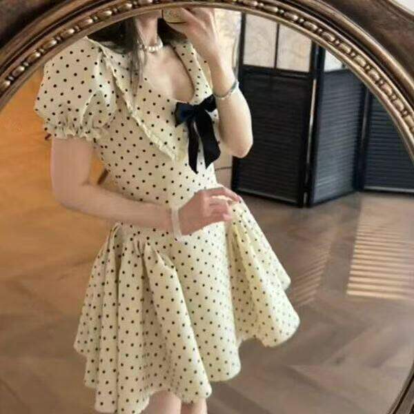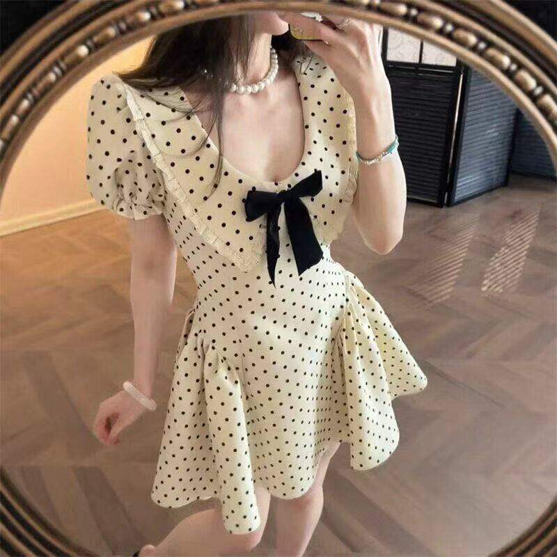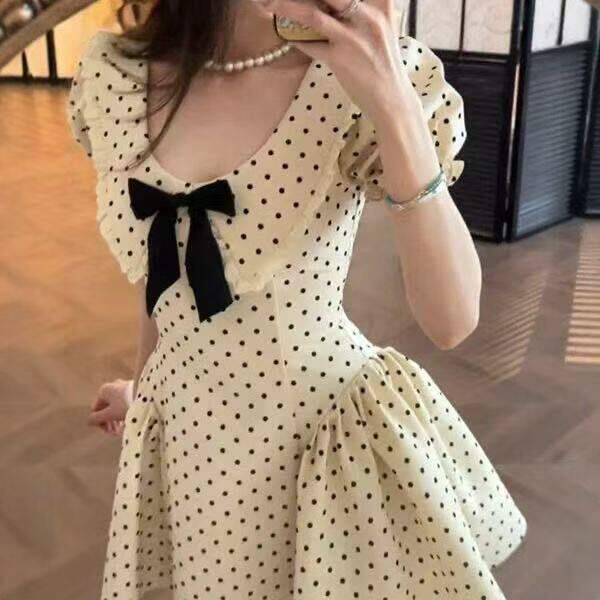 miu系千金风蝴蝶结短袖波点洋装女夏季新款收腰别致绝美a字短裙
