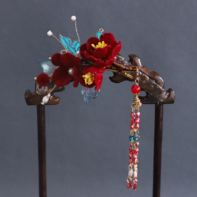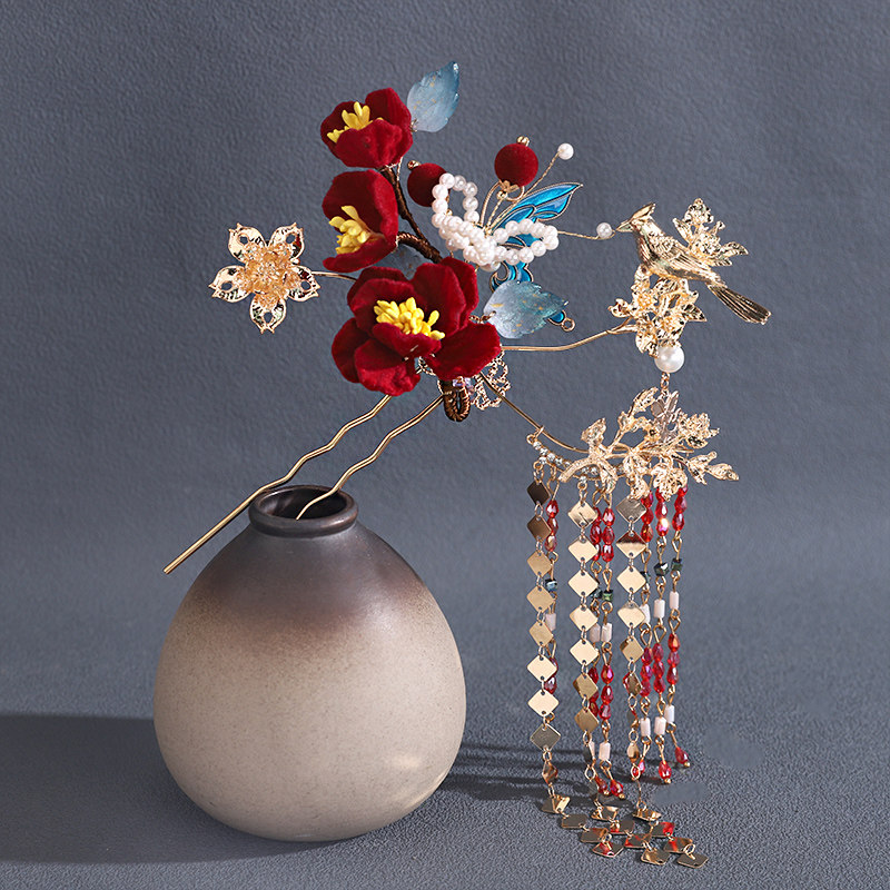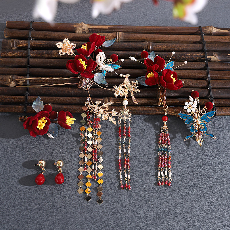 新款中式红色国风绒花秀禾发簪头饰新娘龙凤褂汉服婚礼发饰套装