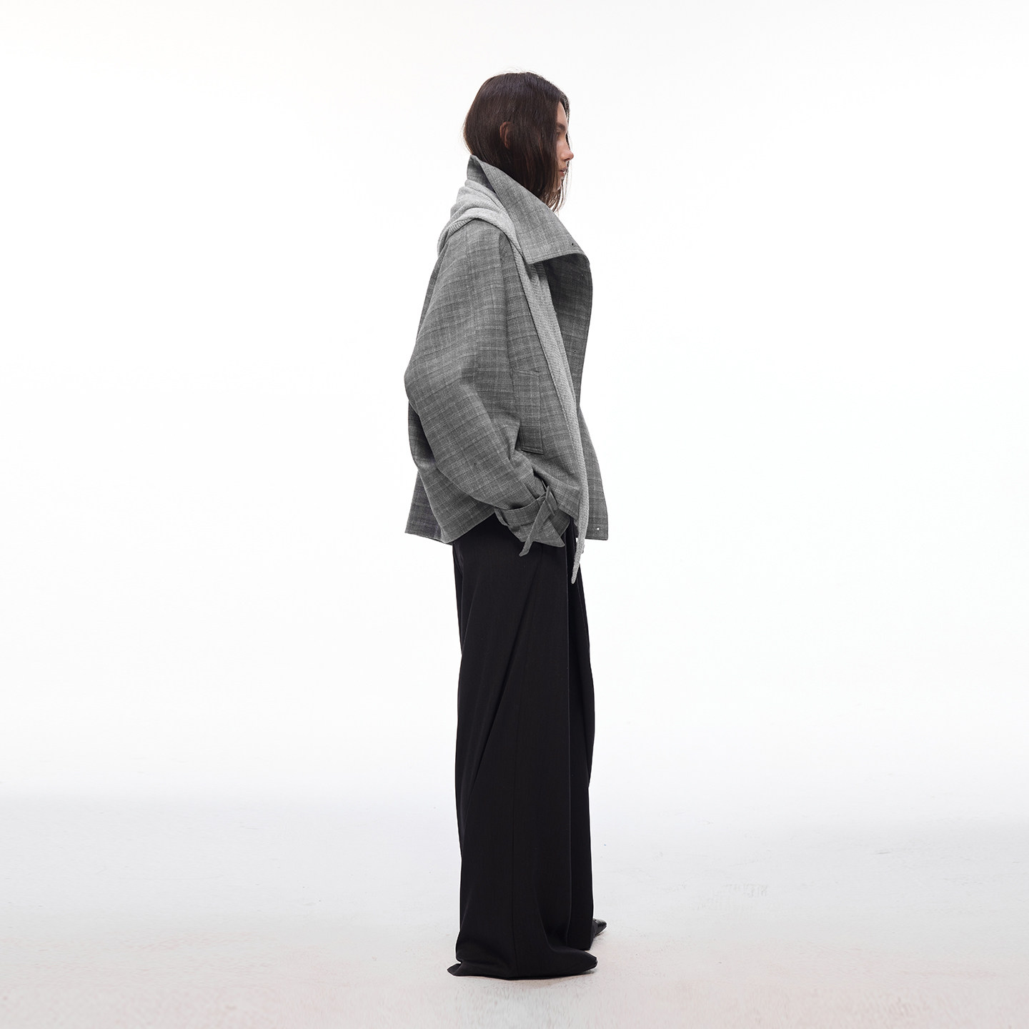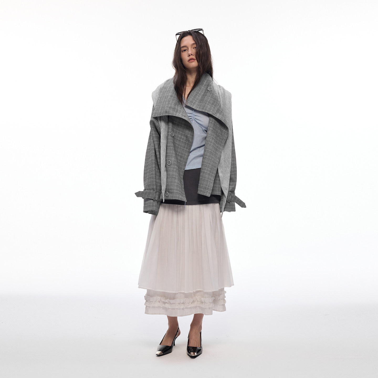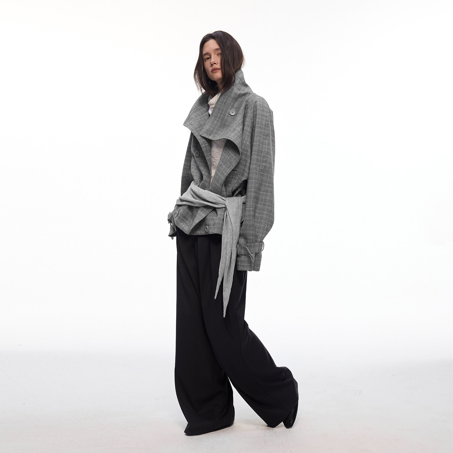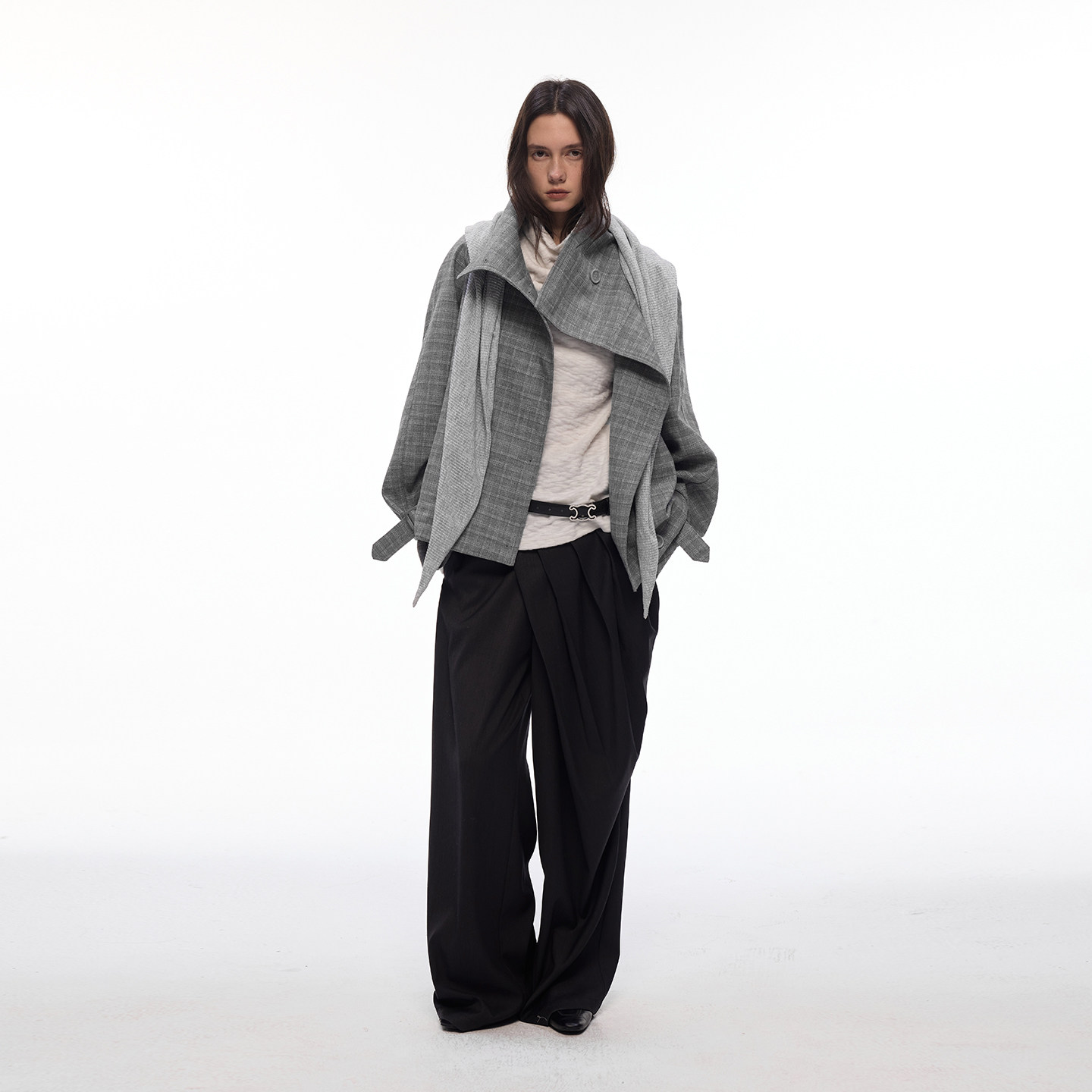 【都市漫行家】BiLLconch高智感·灰色格纹翻领格子外套披肩风衣