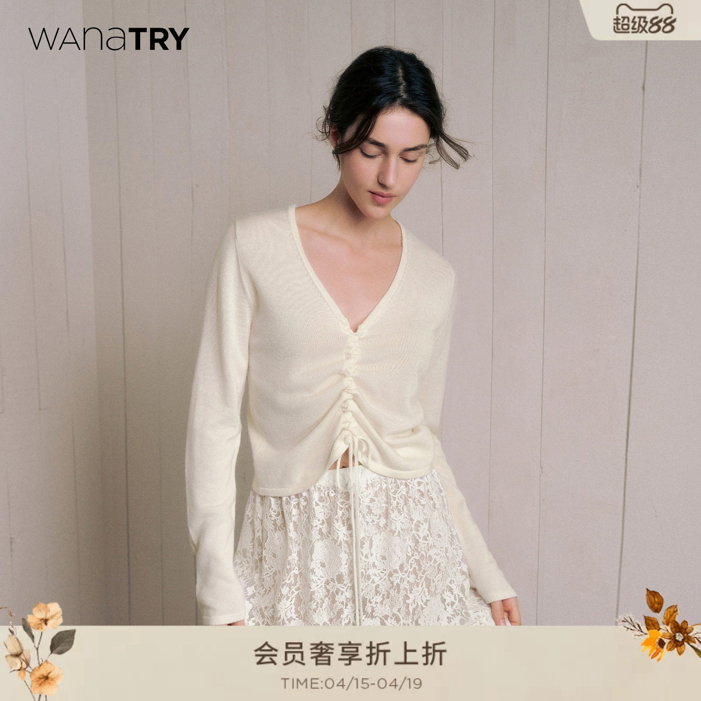 wana try抽绳设计白色针织上衣2025秋季新款简约时髦女款针织衫