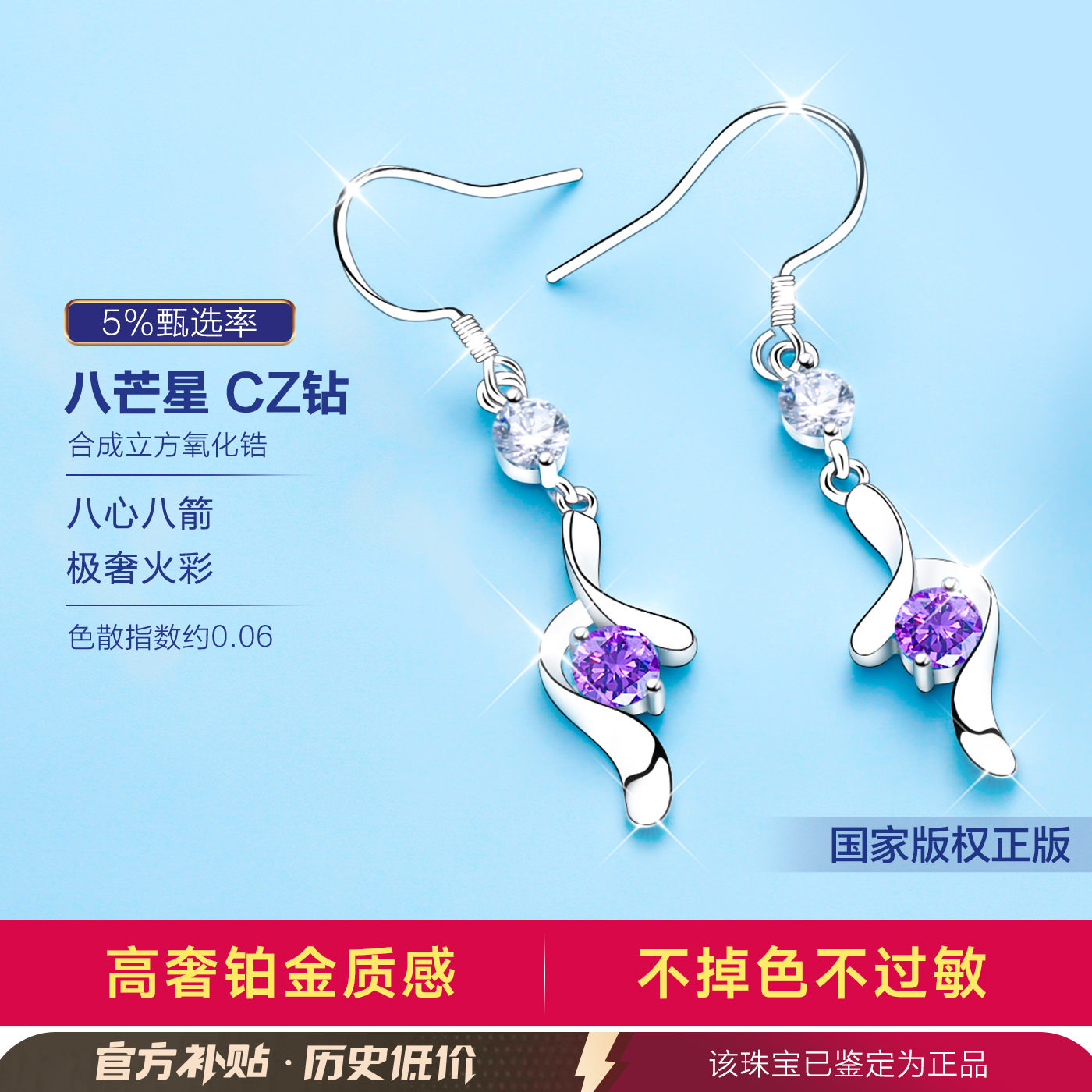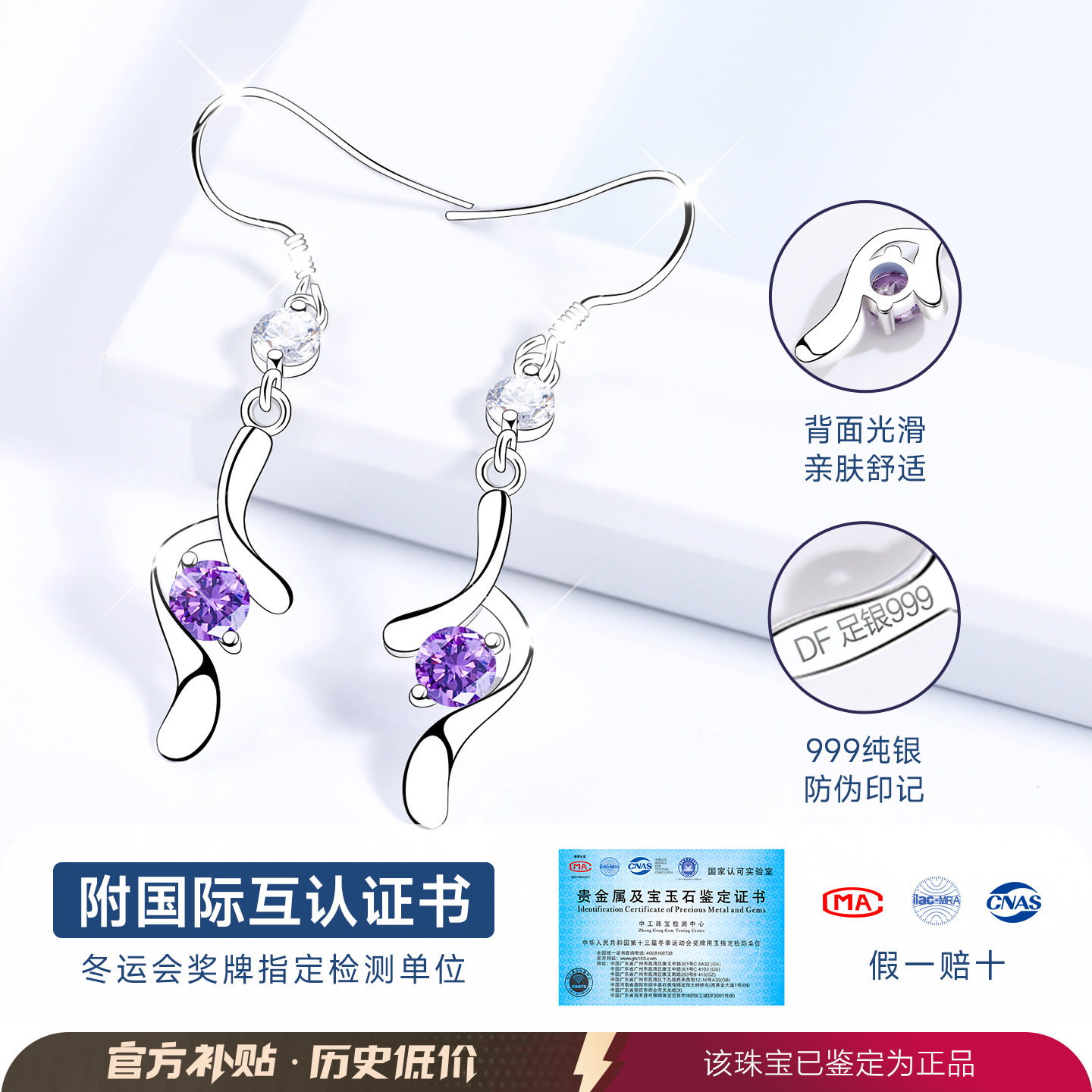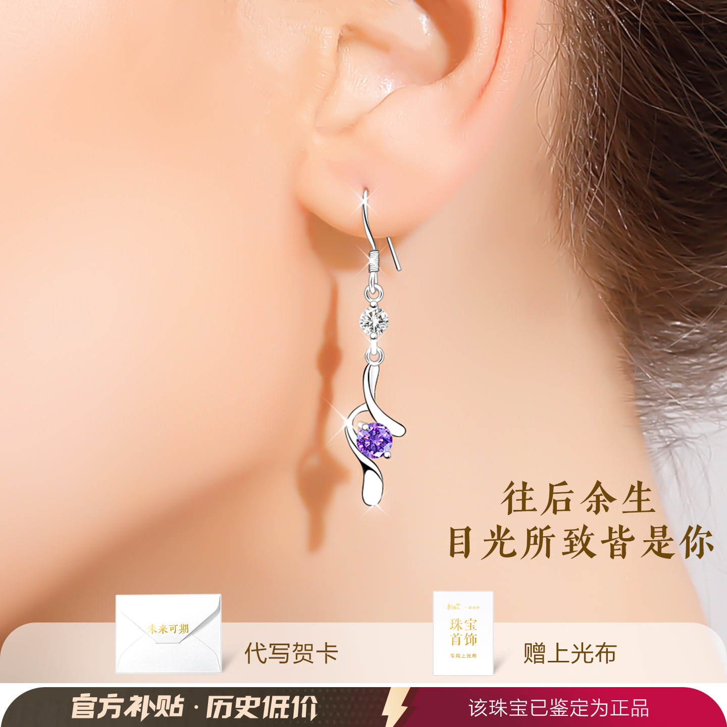 999纯银耳环2026新款爆款高级感999足银耳钩款耳坠女紫色耳饰耳钉