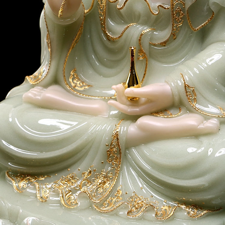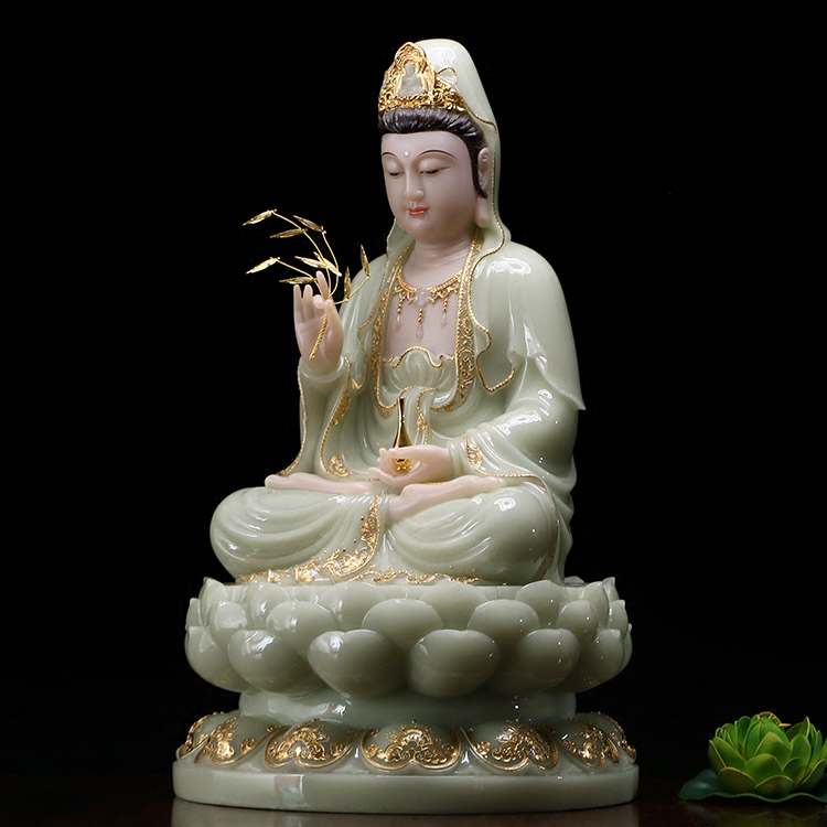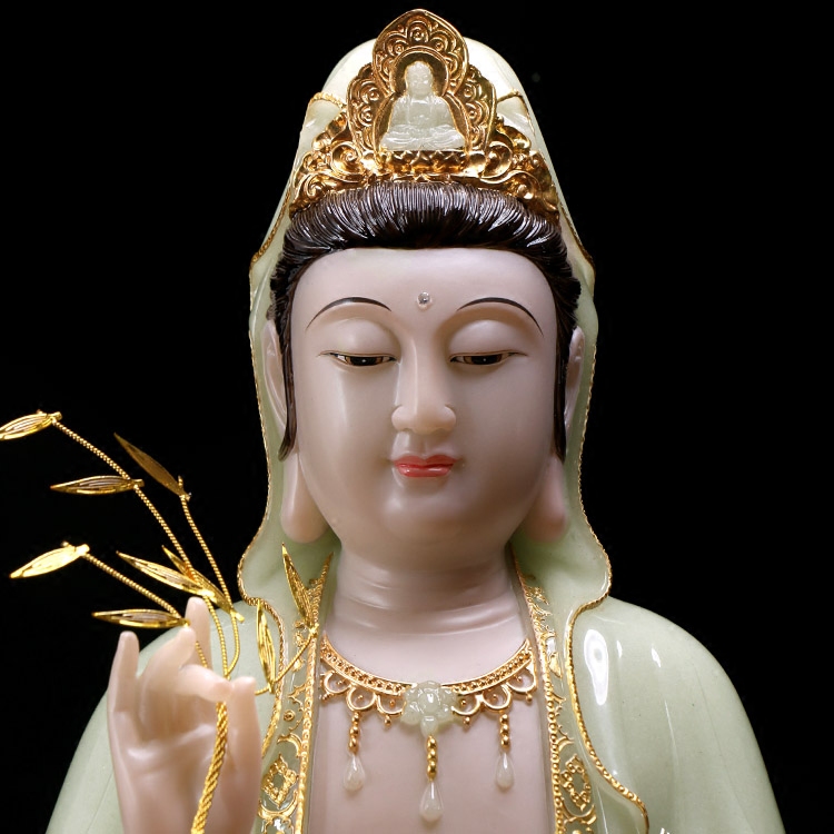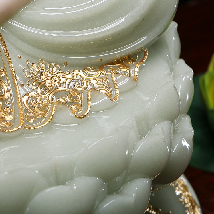 汉白玉观音菩萨佛像家用供奉娑婆三圣翠玉镶金坐莲观世音雕像摆件