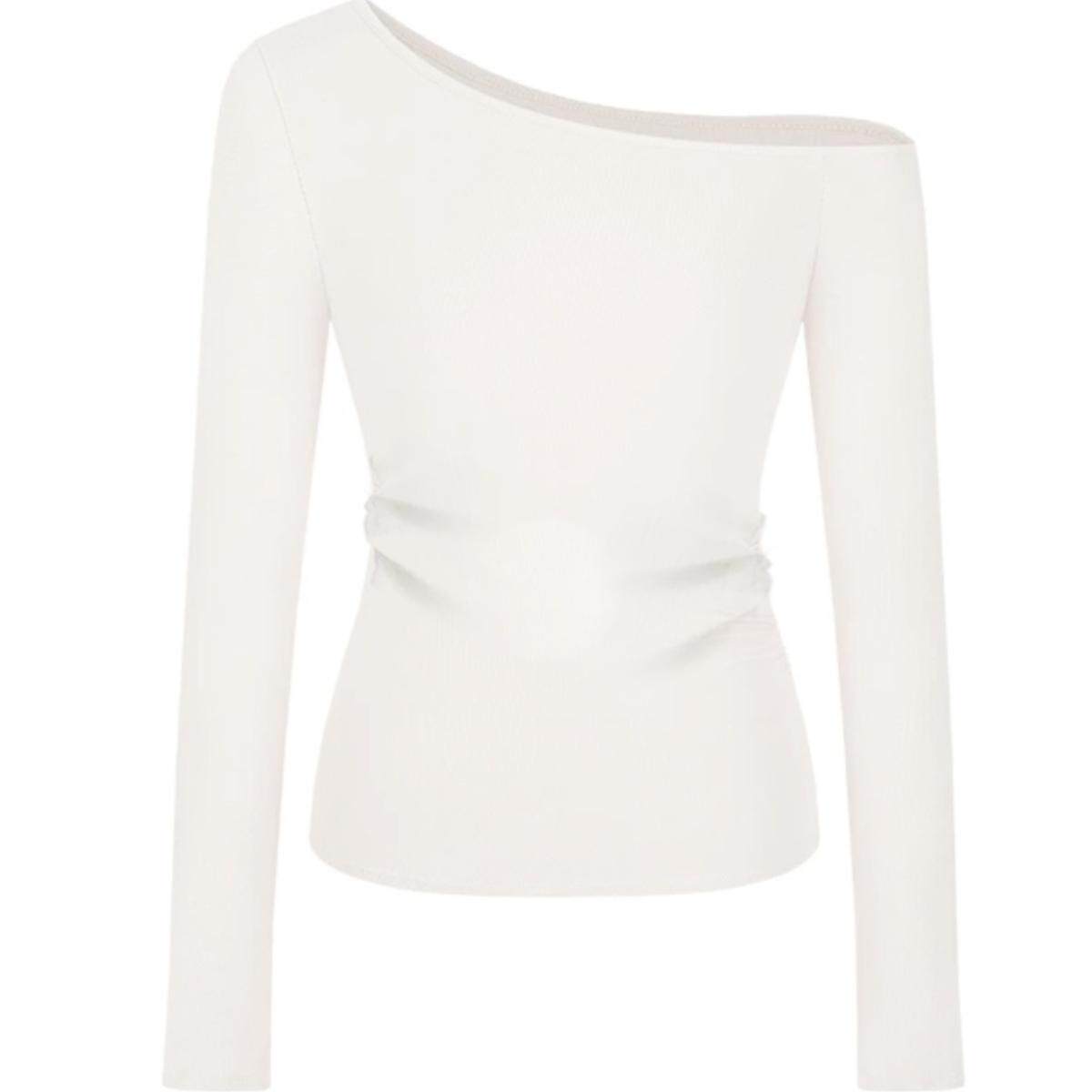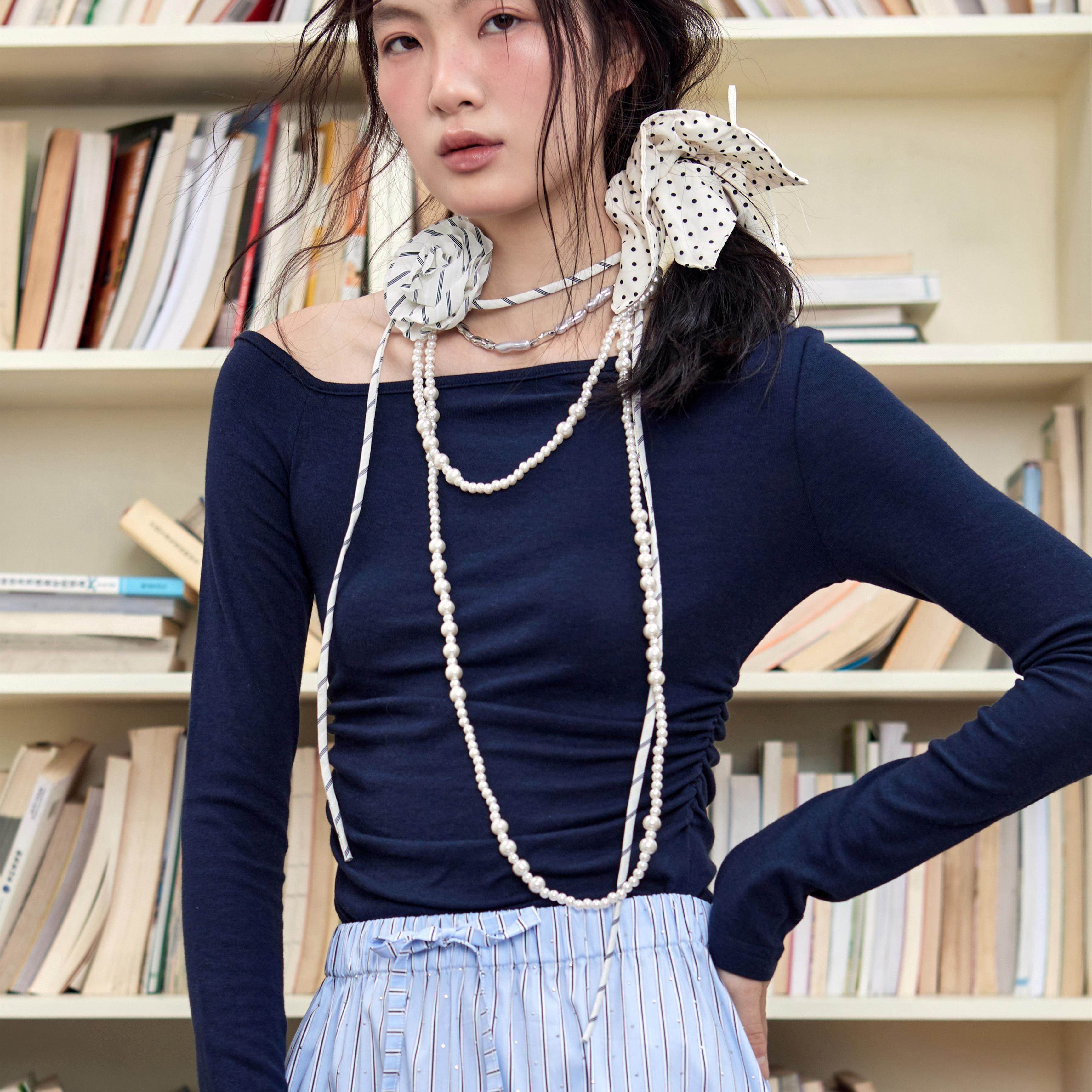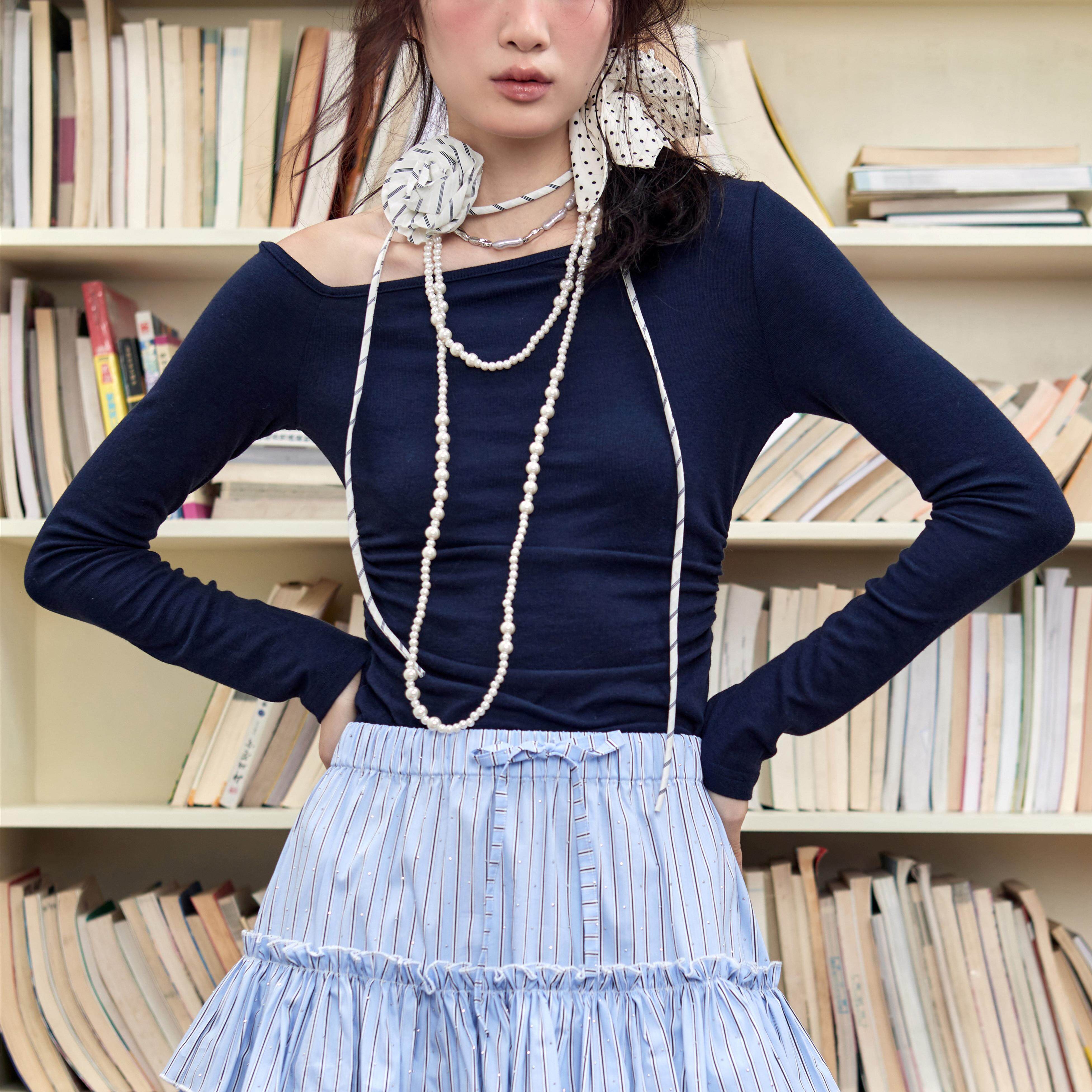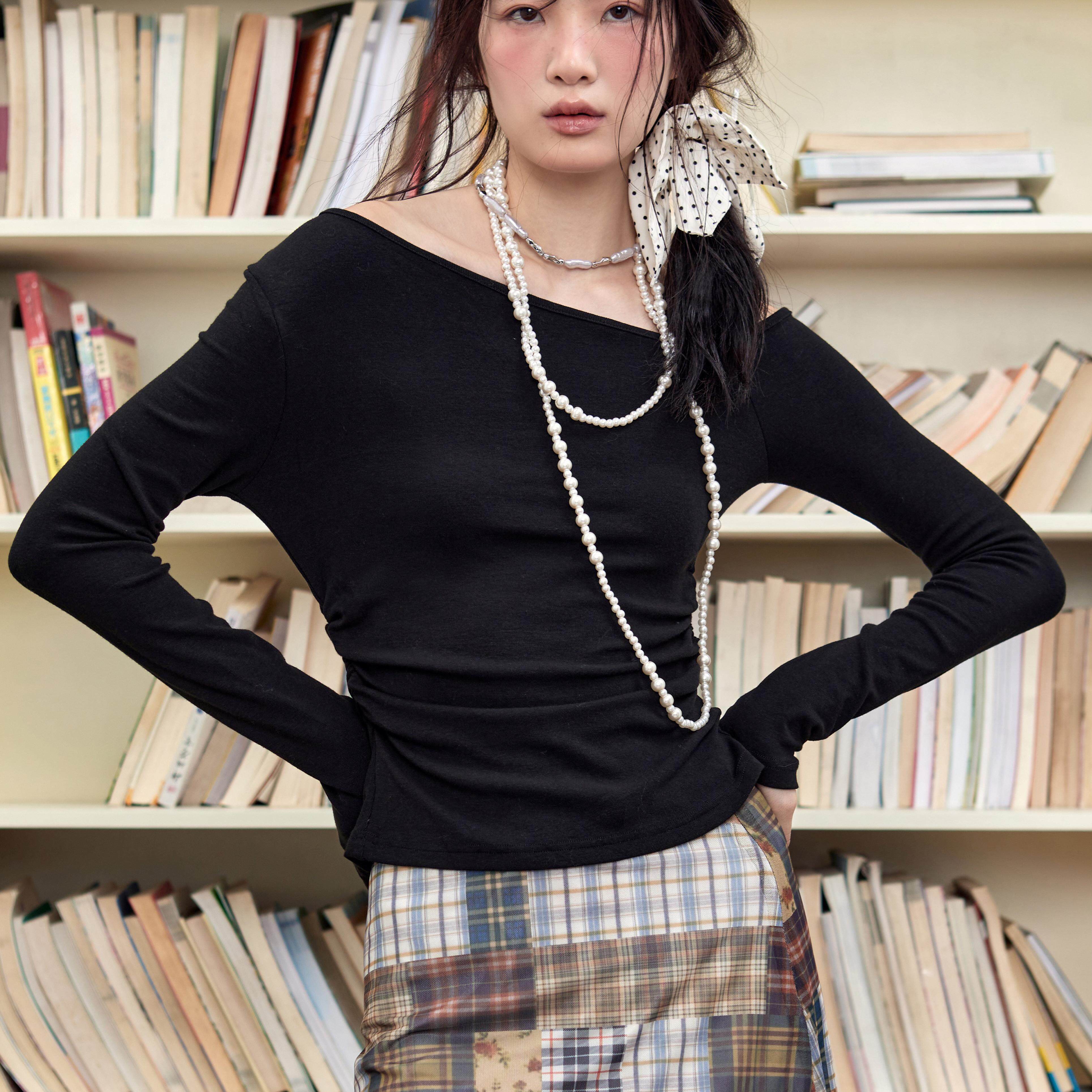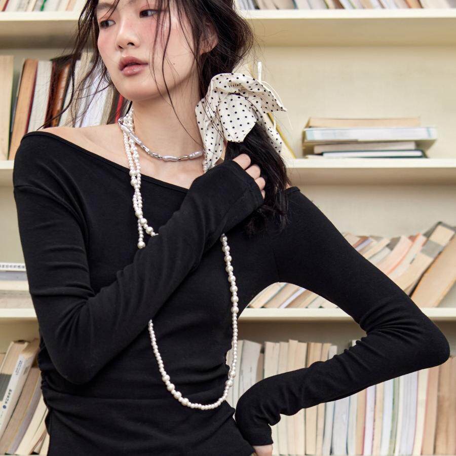 Shiitake 3色斜肩长袖修身打底气质舒适百搭露肩上衣