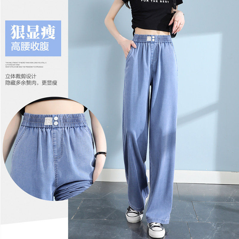 拉夏贝尔天丝牛仔裤女夏季薄款小个子垂感显瘦休闲 宽裤冰丝裤子