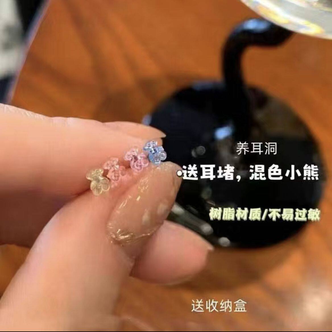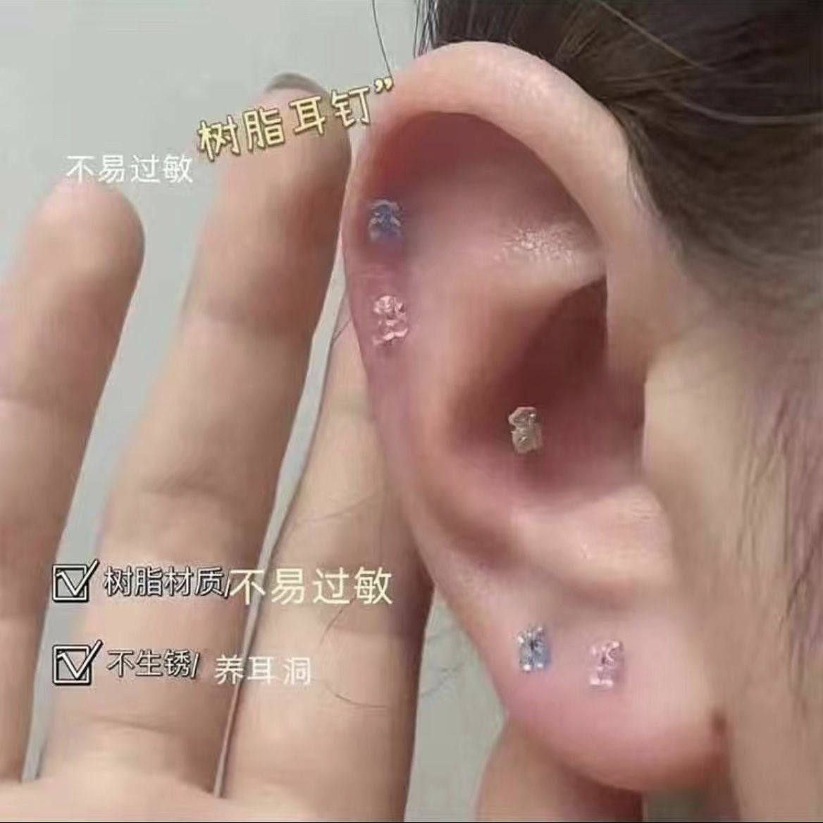 小熊耳钉树脂透明隐形耳棒养耳洞发炎消毒消炎免摘塑料学生防堵