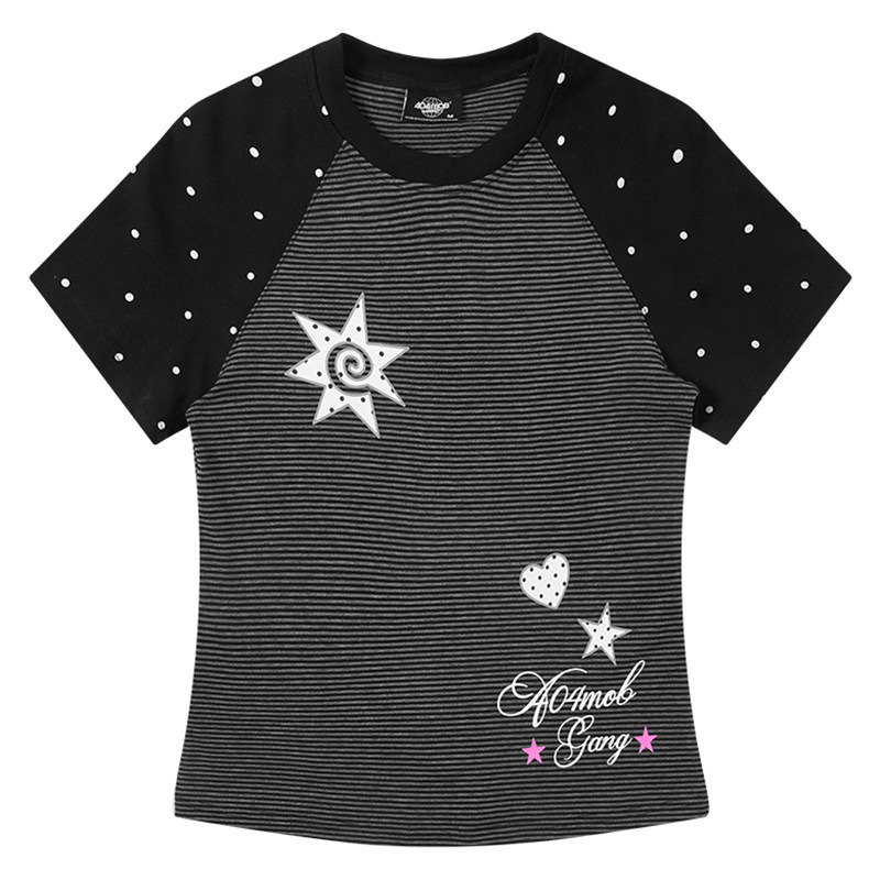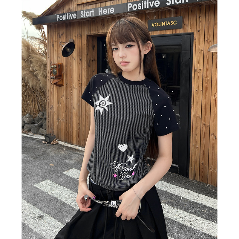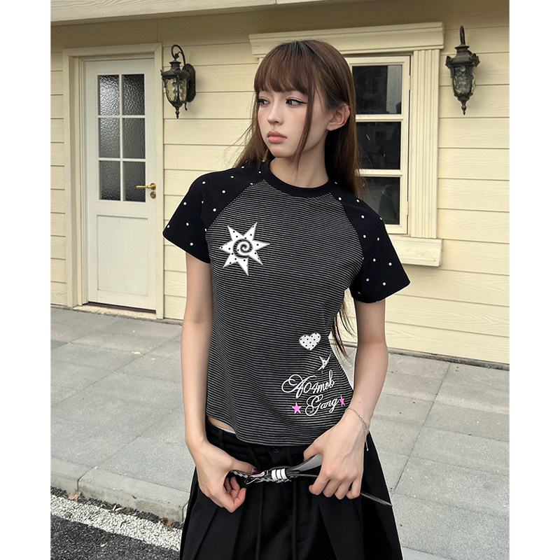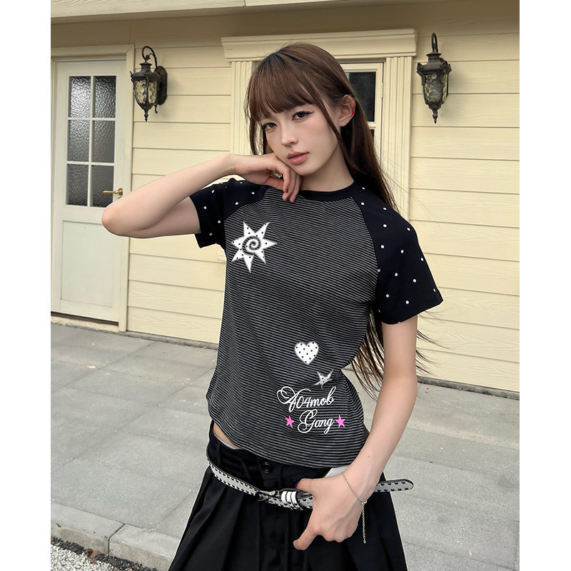 404MOB波点拼接美式辣妹短袖T恤女2026夏季修身短款正肩Y2K显瘦潮