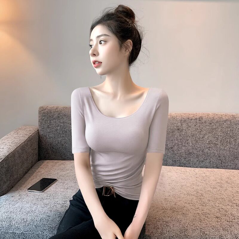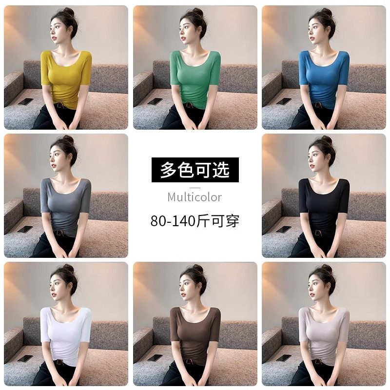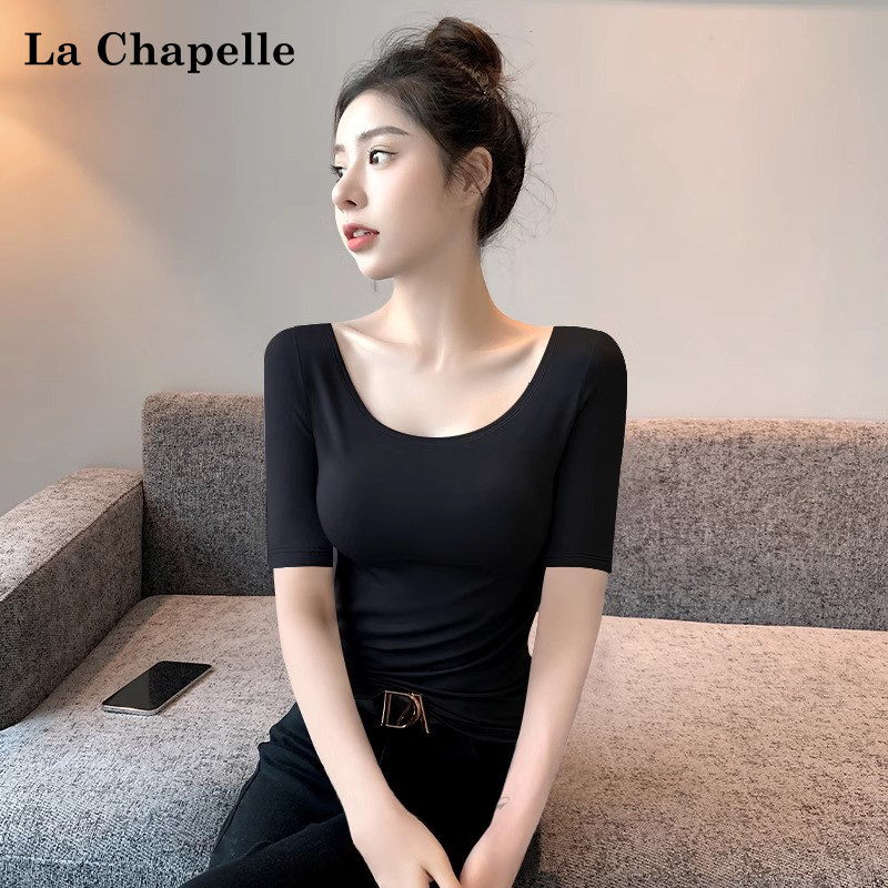 拉夏贝尔莫代尔中袖打底衫女春秋低领百搭五分袖上衣洋气内搭T恤