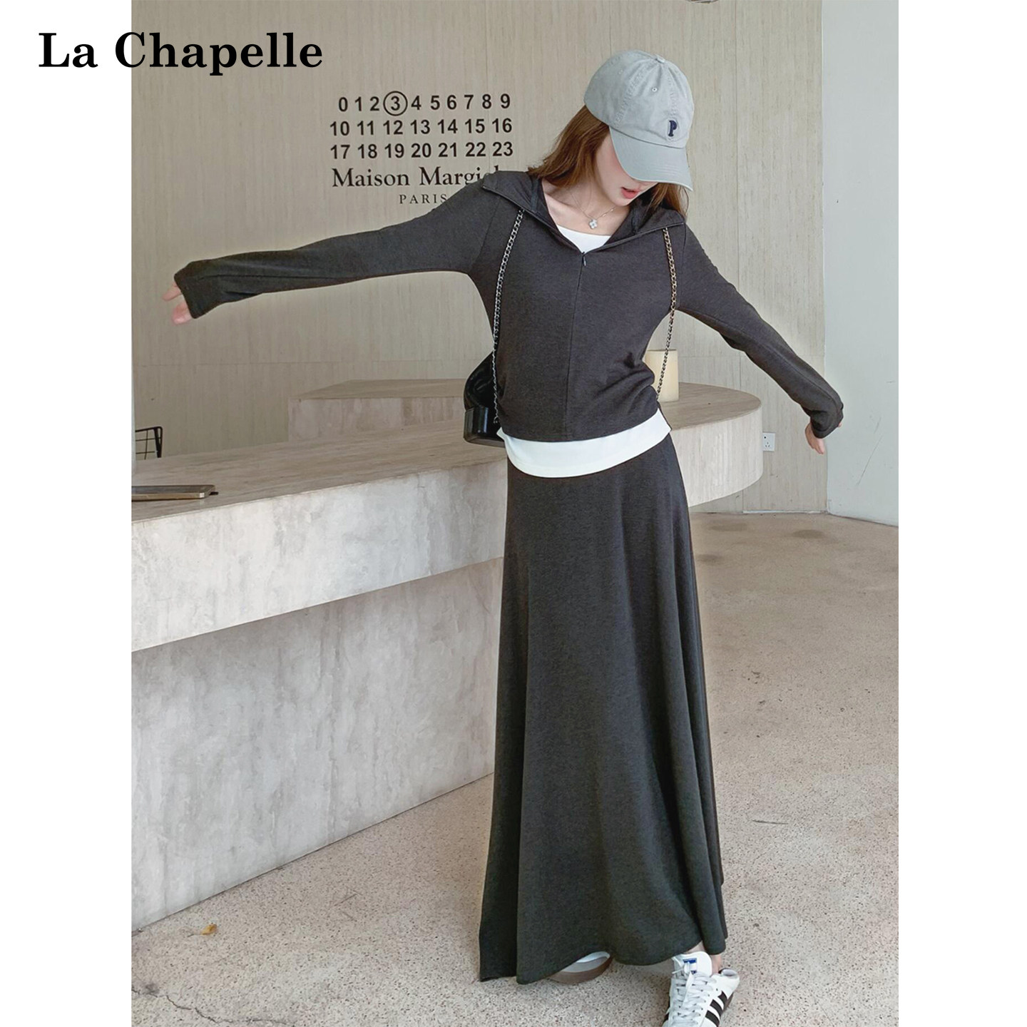 拉夏贝尔假两件长袖卫衣休闲裤套装女秋深灰色连帽上衣半裙两件套