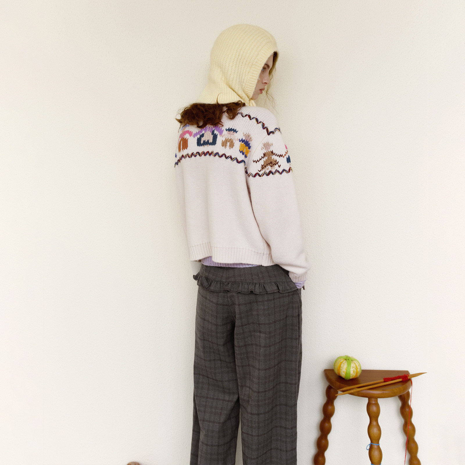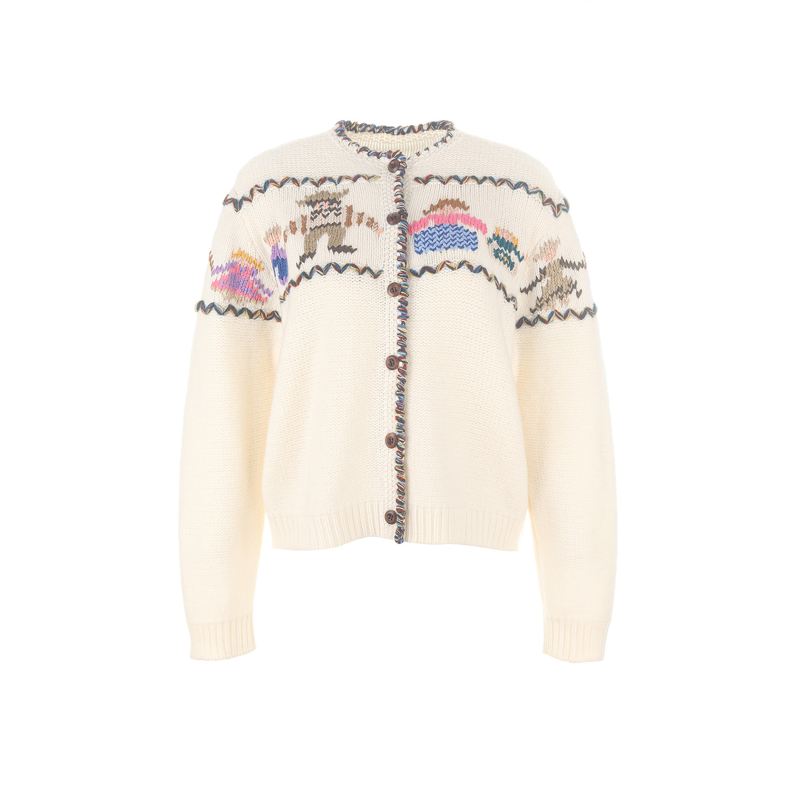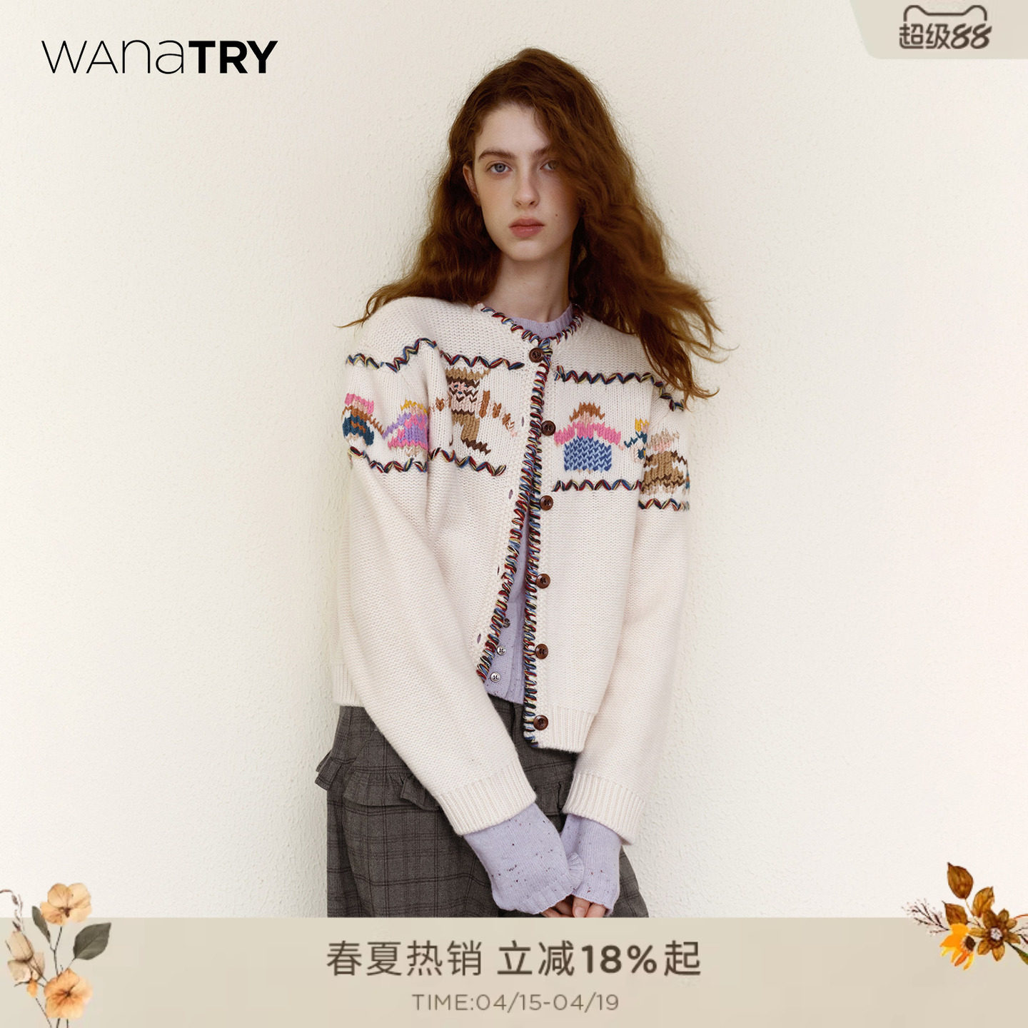 wana try绵羊毛卡通小人复古开衫米色2025冬季新款宽松女款上衣
