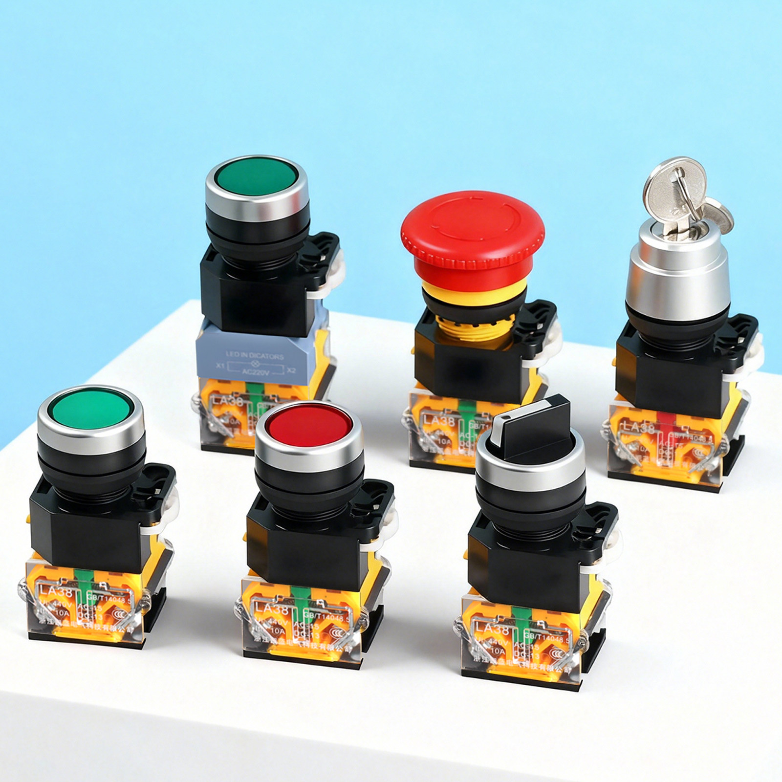 LA38按钮开关配件平钮自复位开孔22MM自锁旋钮急停蘑菇头灯座平头