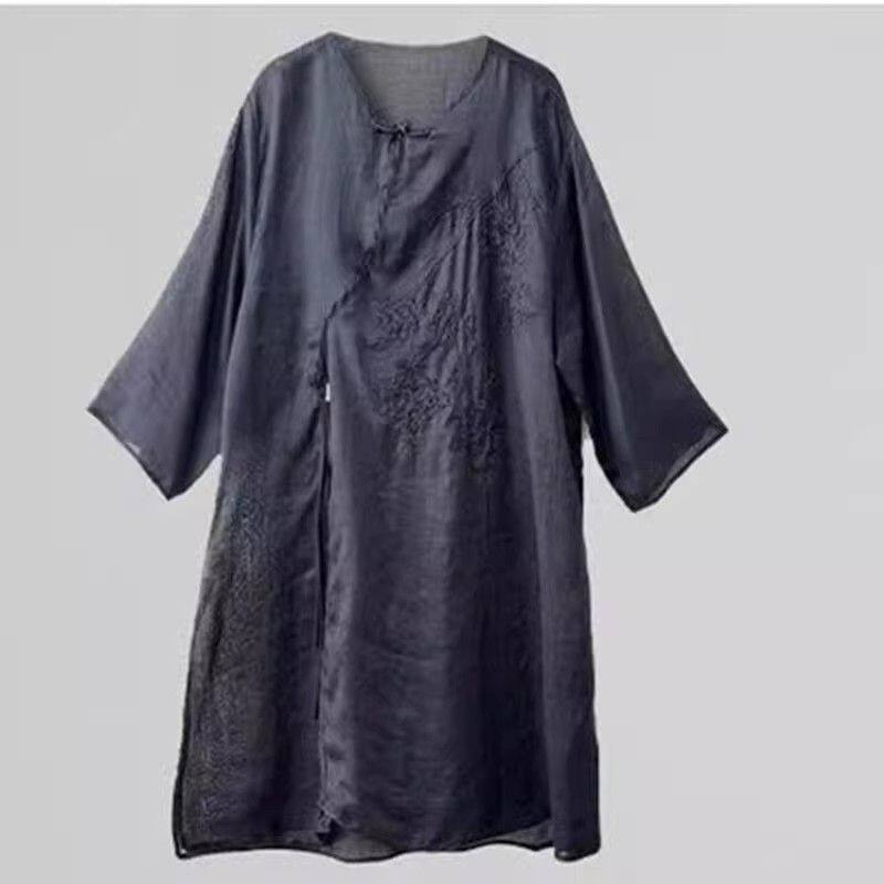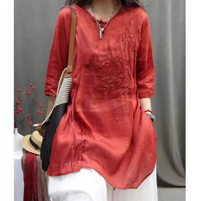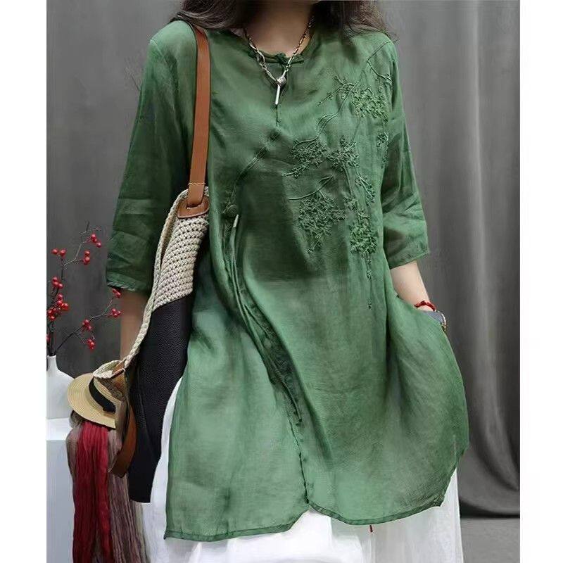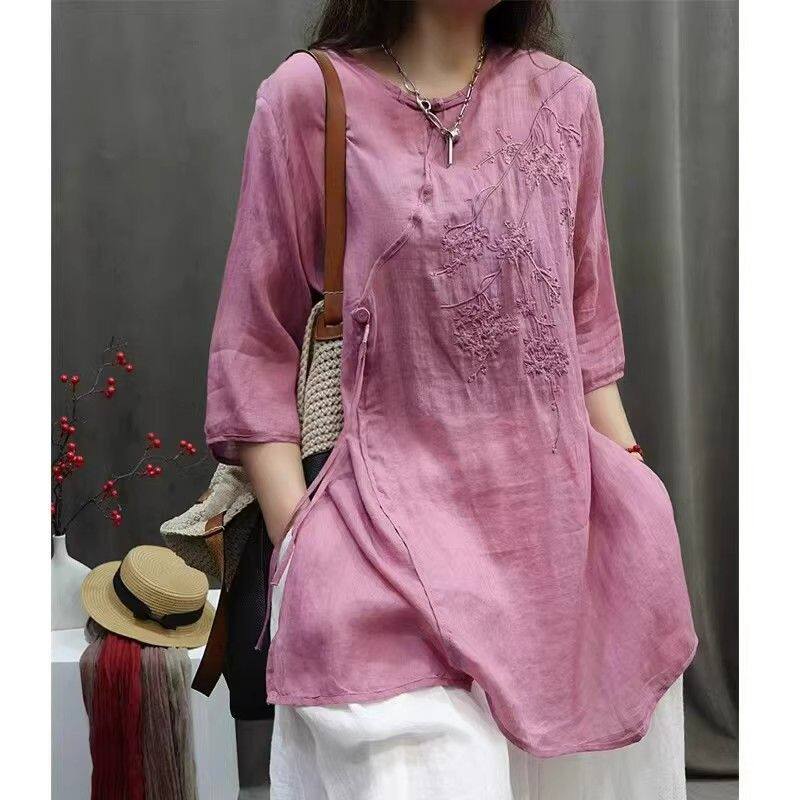 新中式国风刺绣棉麻衬衫女士夏季中年妈妈宽松休闲中长款上衣女