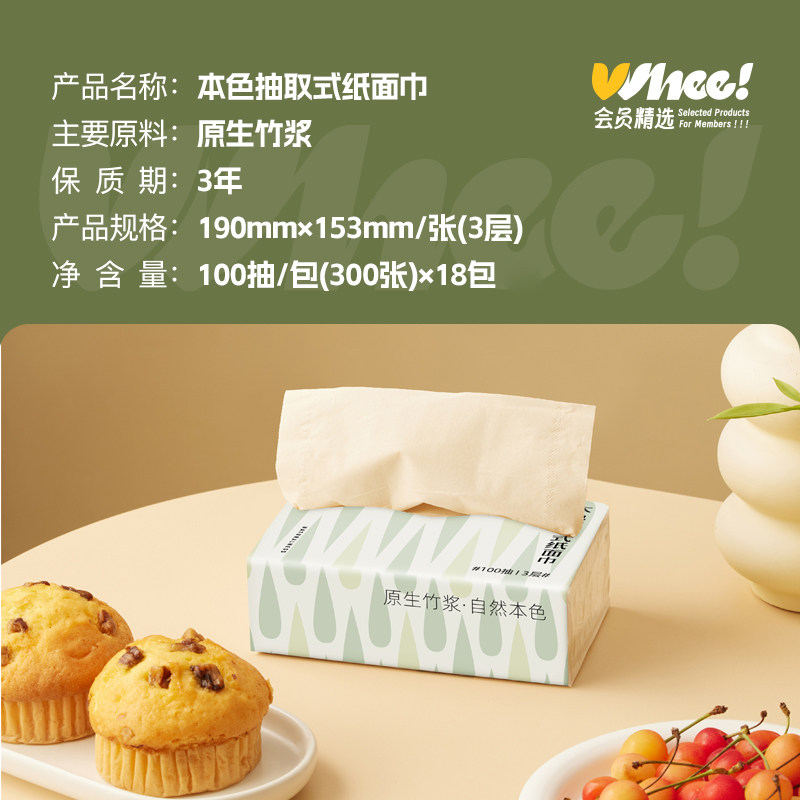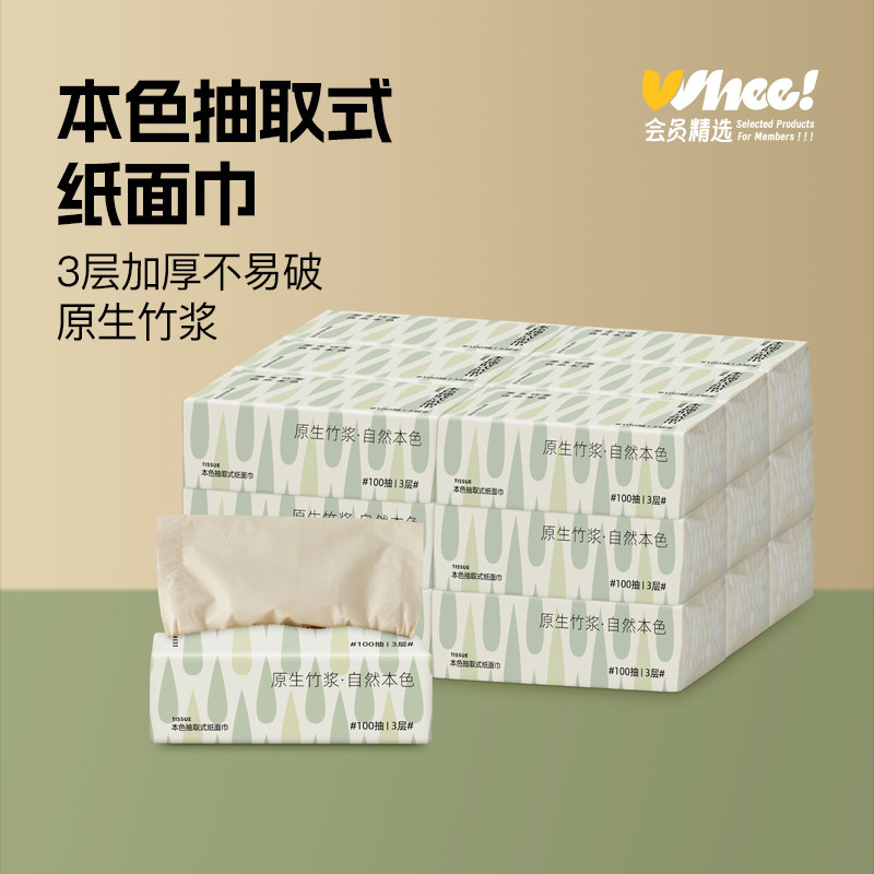 【每日领券】会员精选本色抽取式面巾纸3层加厚原竹抽纸18包