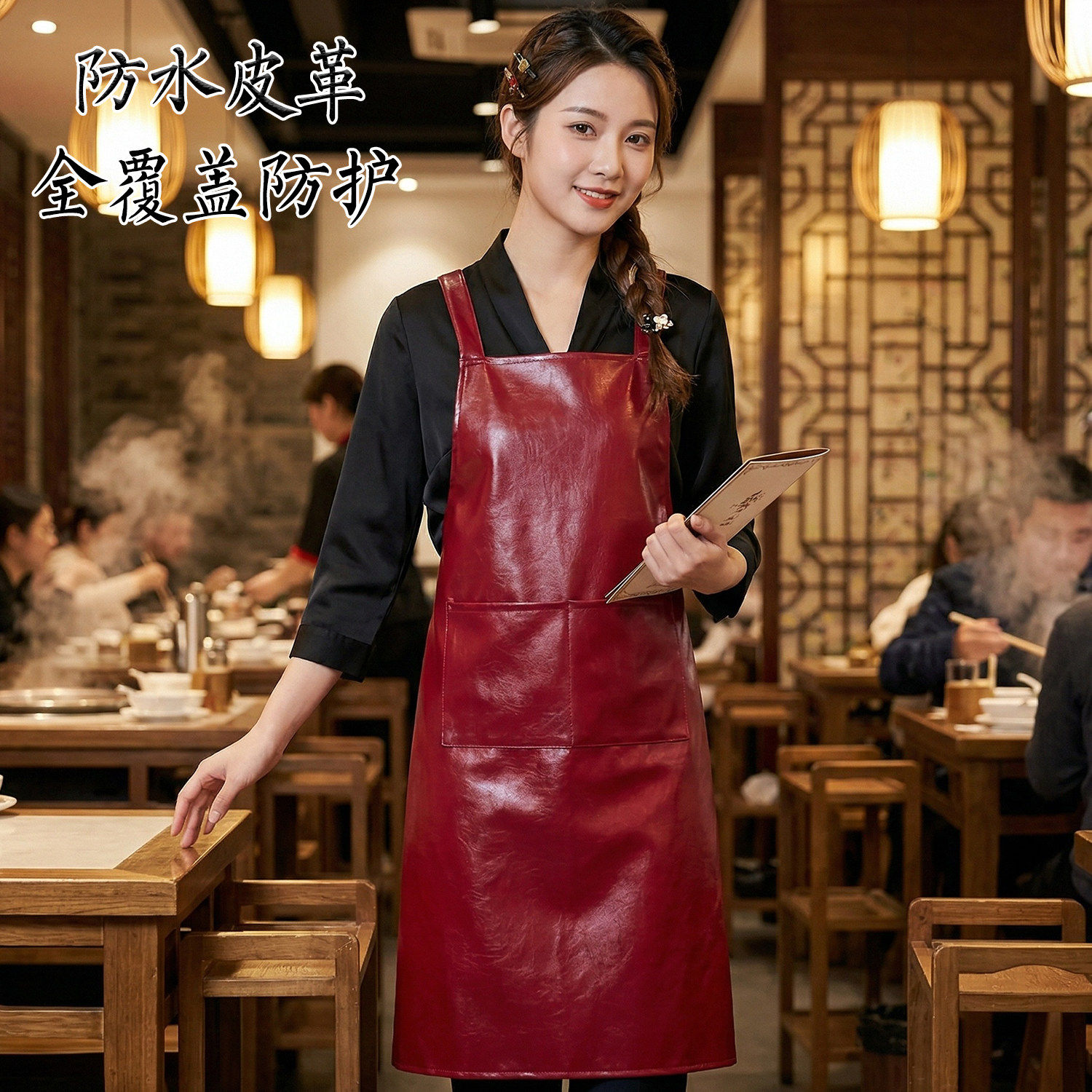 火锅店围裙上班专用防水防油成人PU皮工作服厨房家用定制logo印字