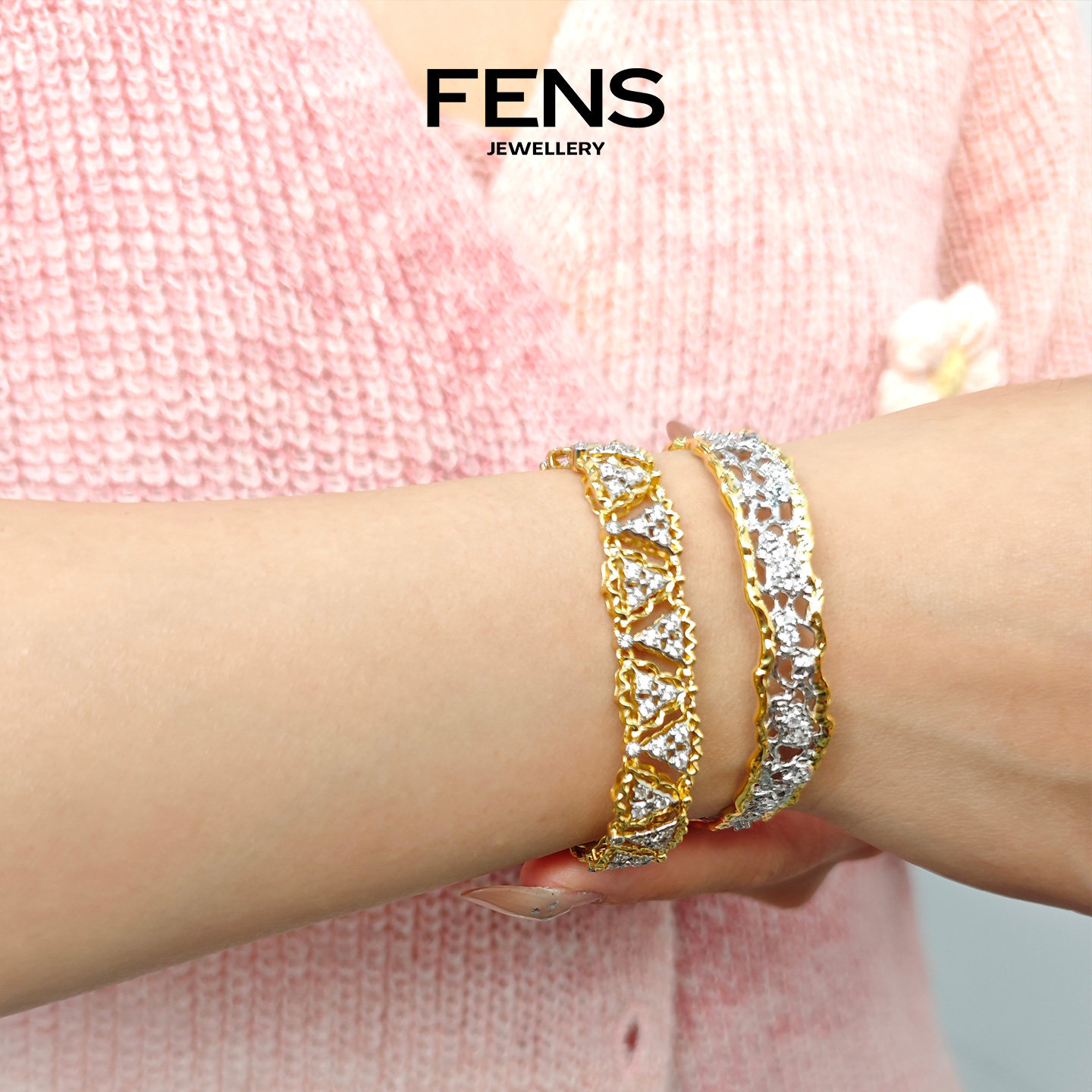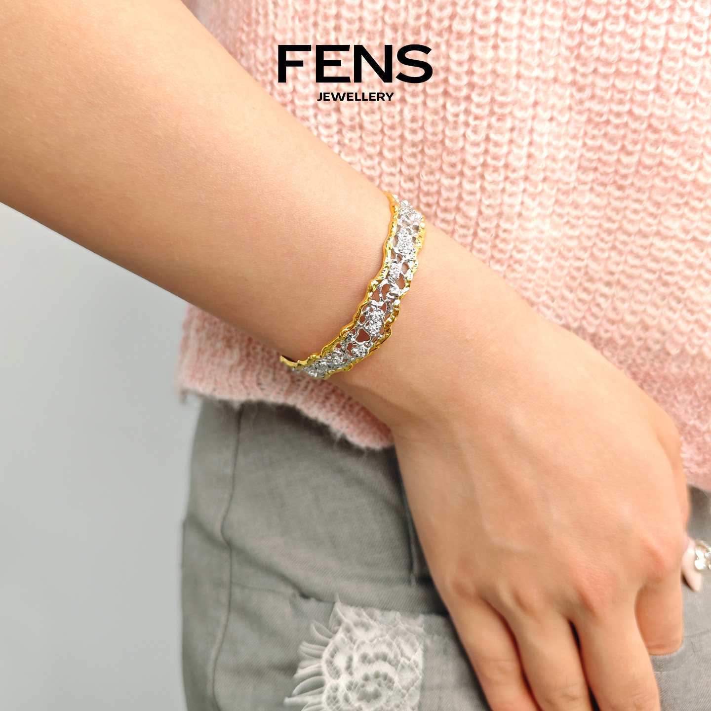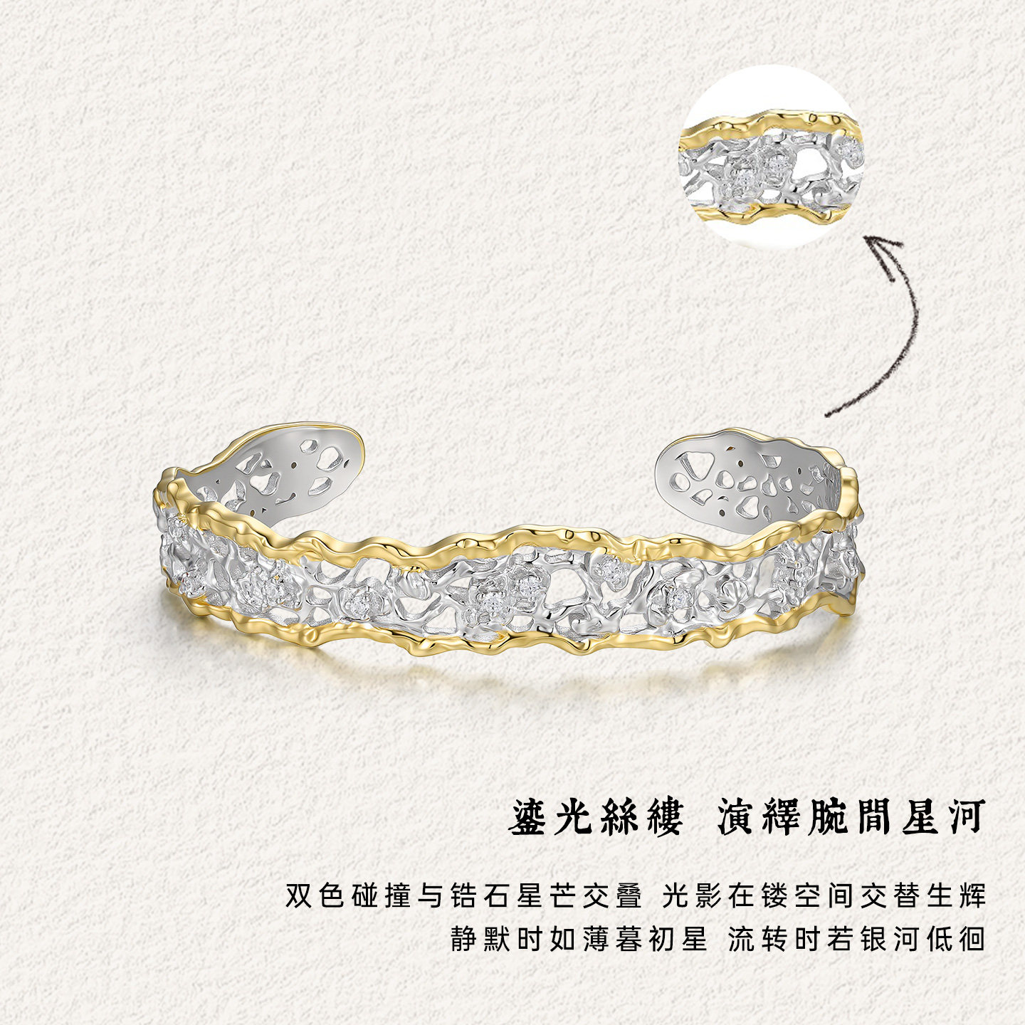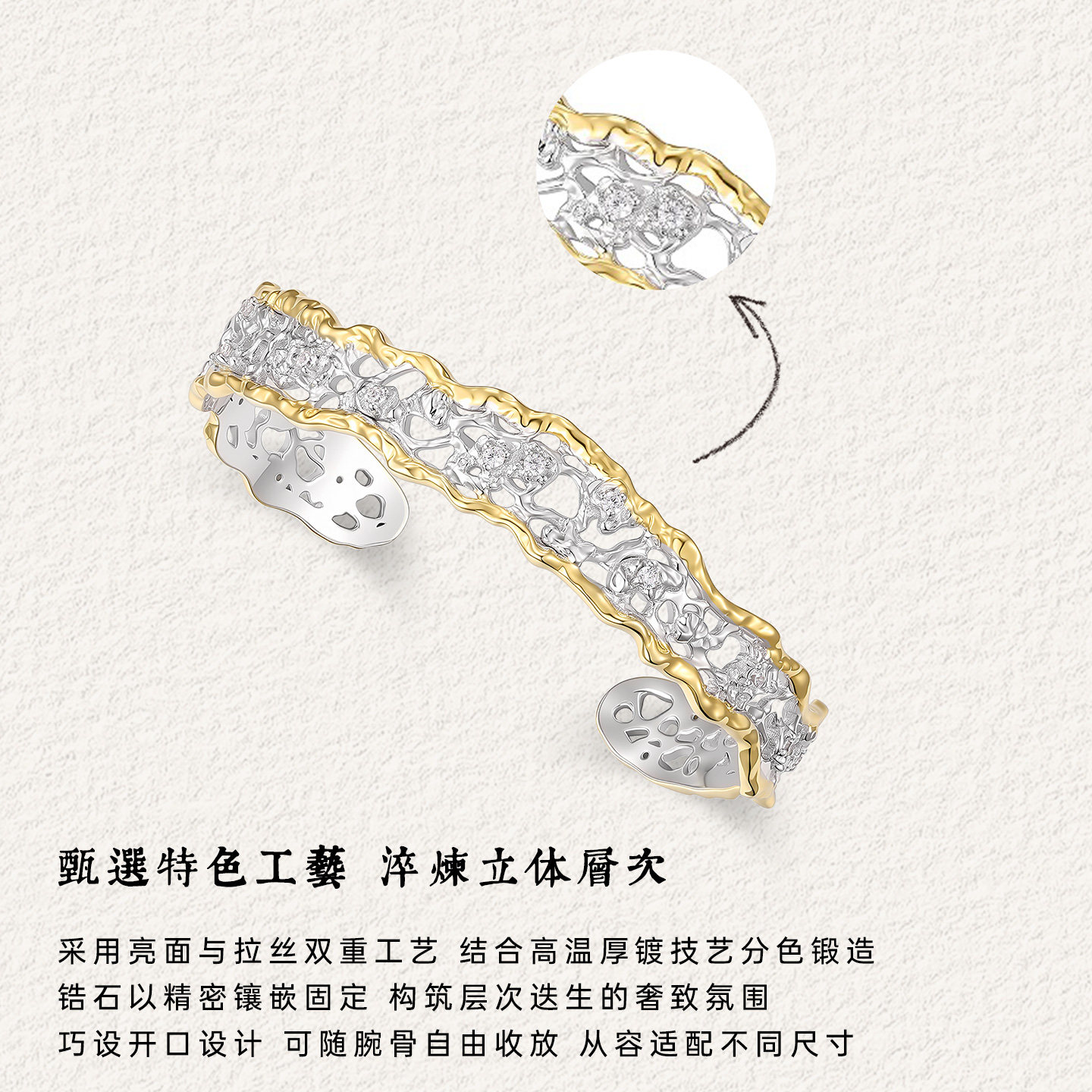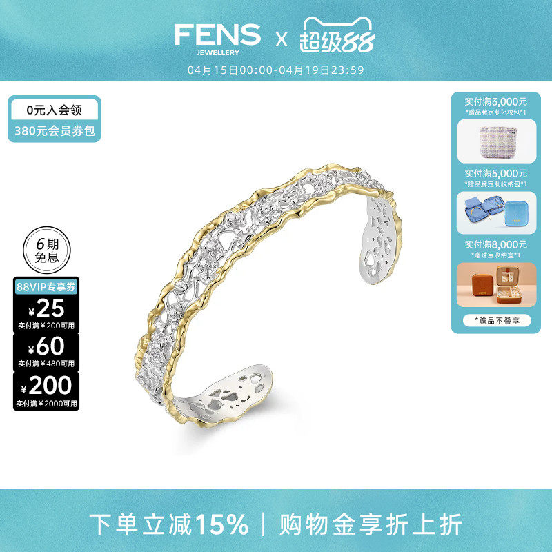 FENS珠宝 浮光织境系列粼韵蕾丝镶石手镯女复古立体镶嵌锆石手饰