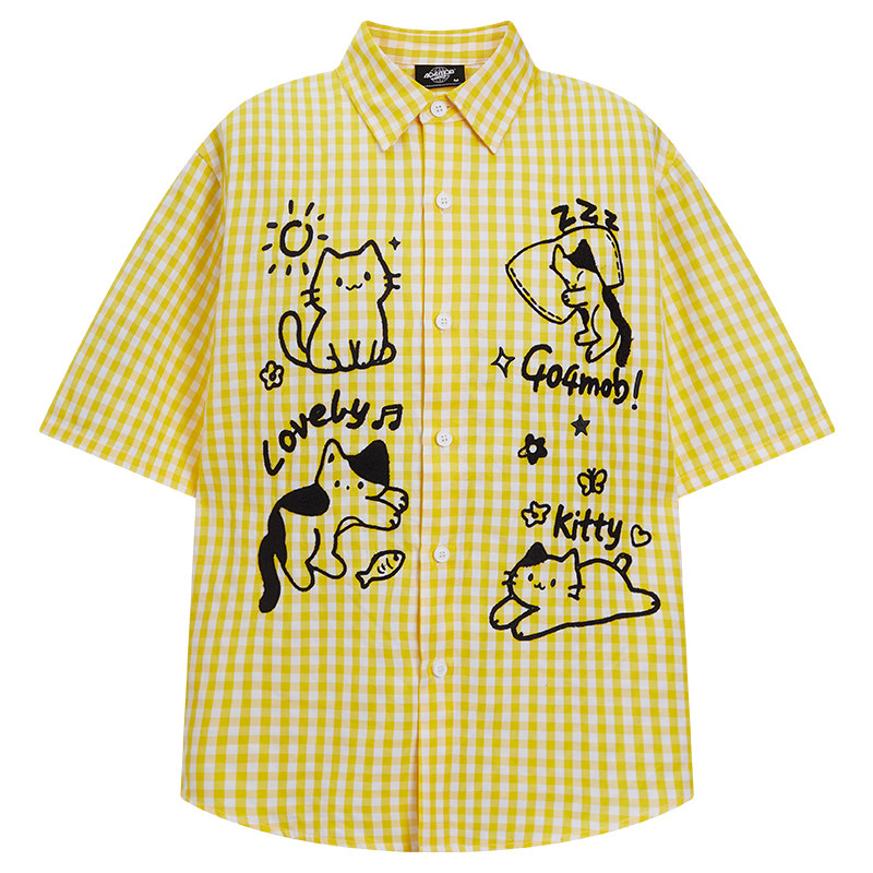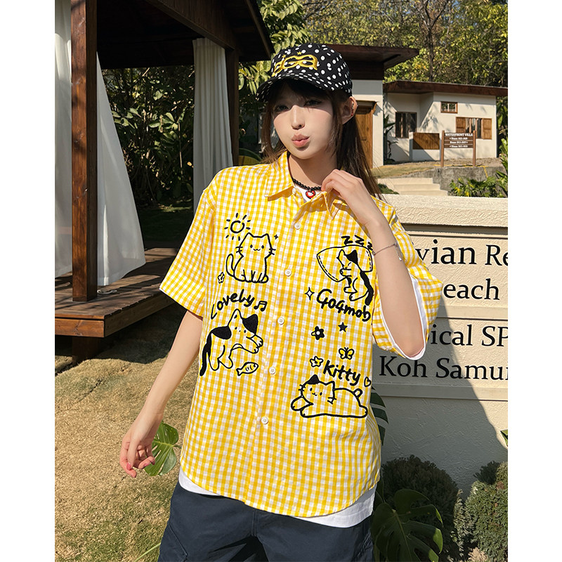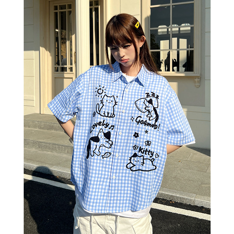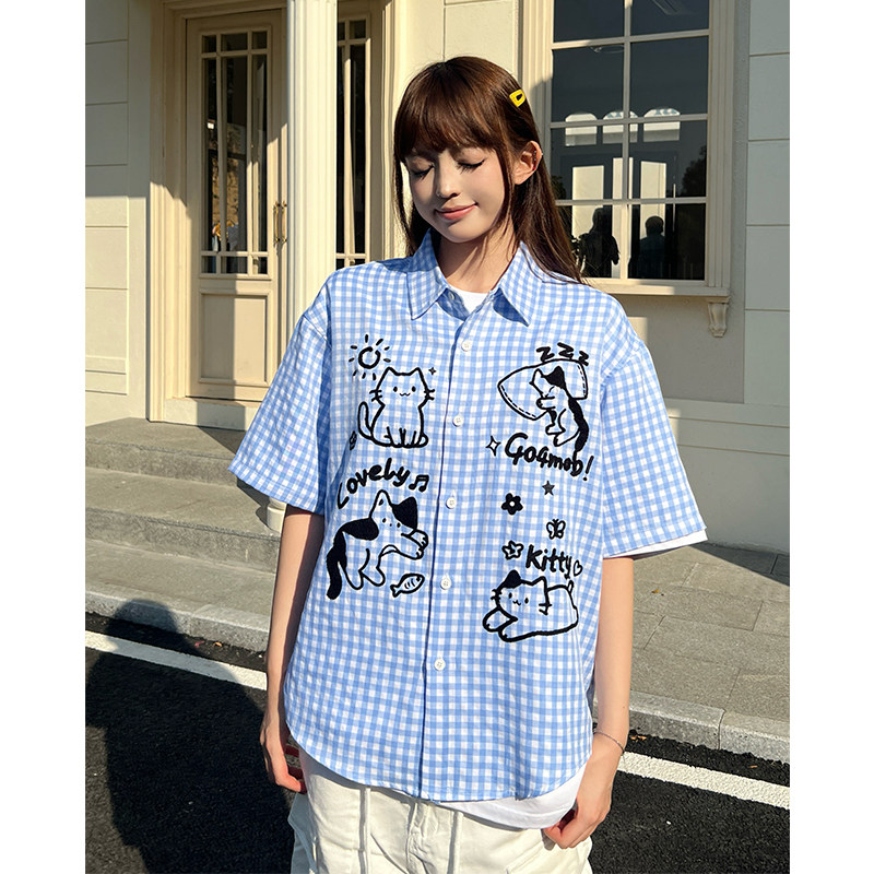 404MOB立体毛巾绣可爱小猫夏季短袖格子衬衫女休闲百搭宽松潮牌t
