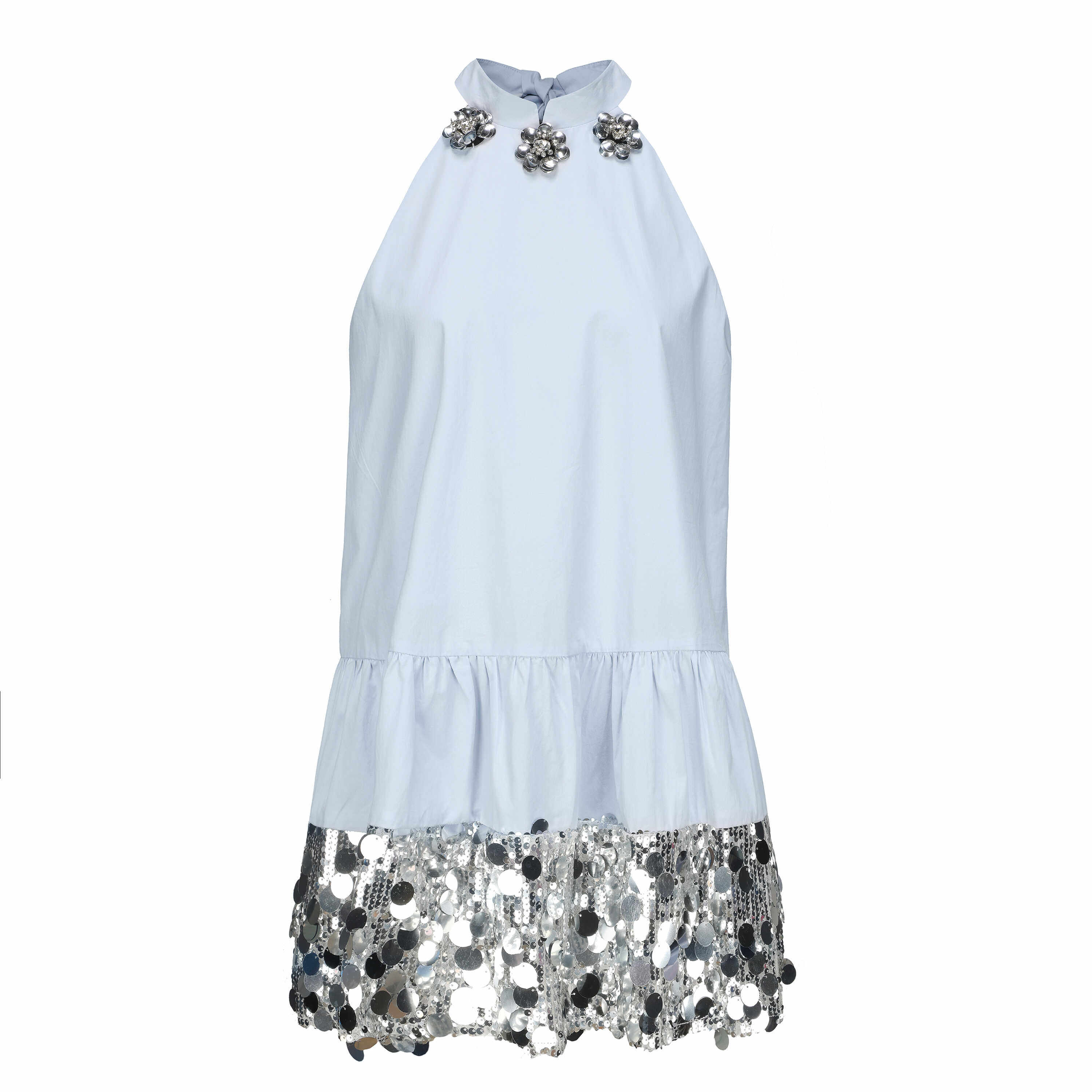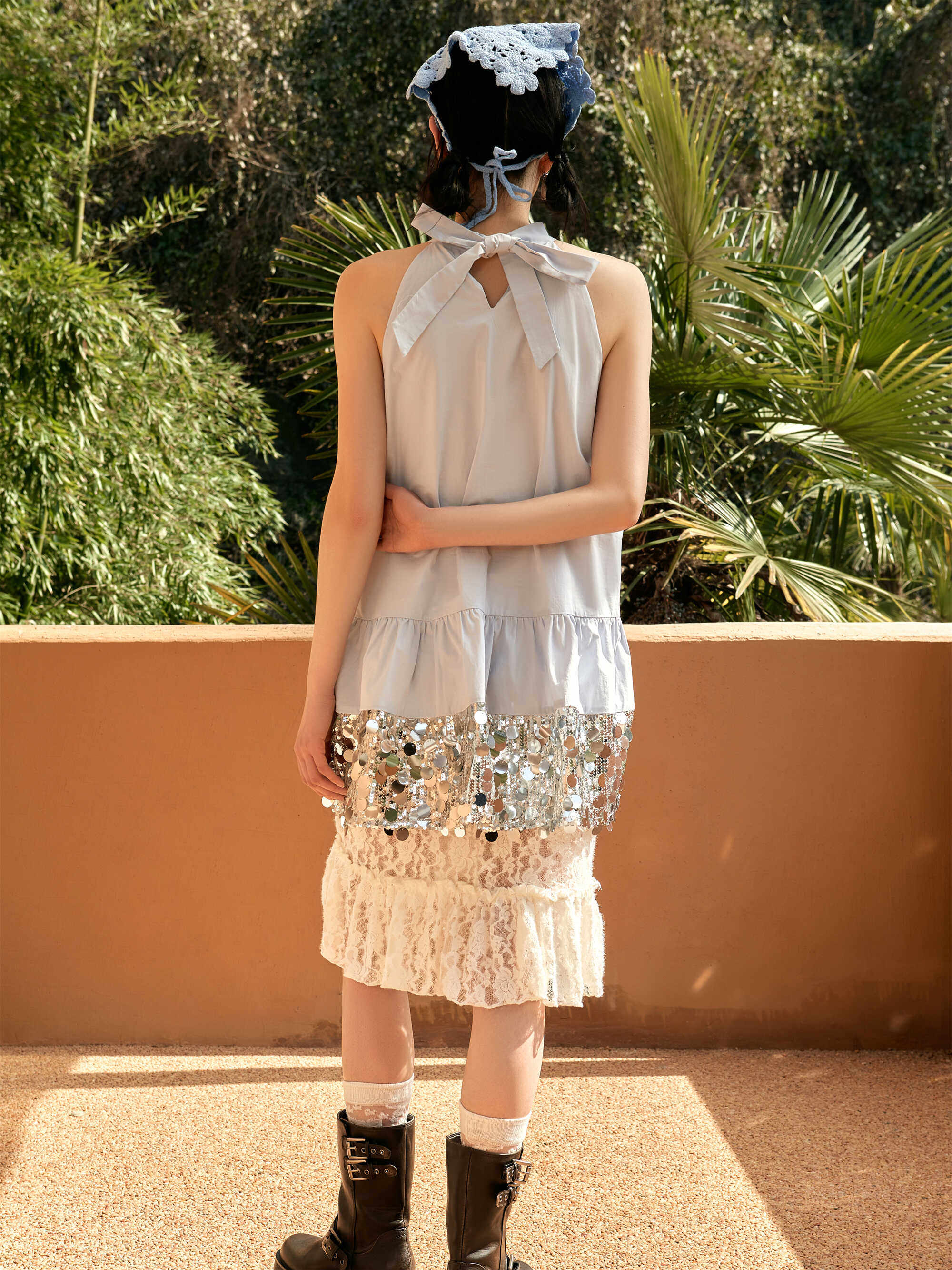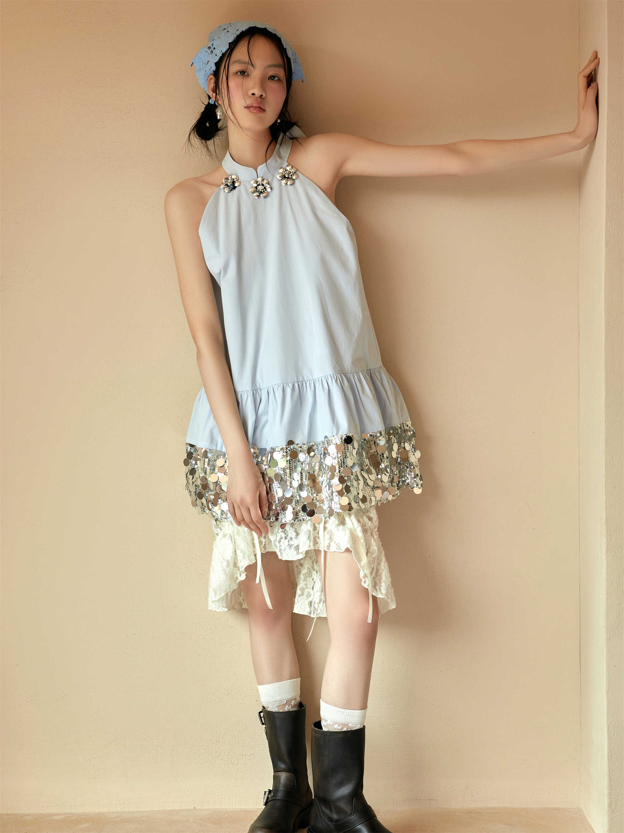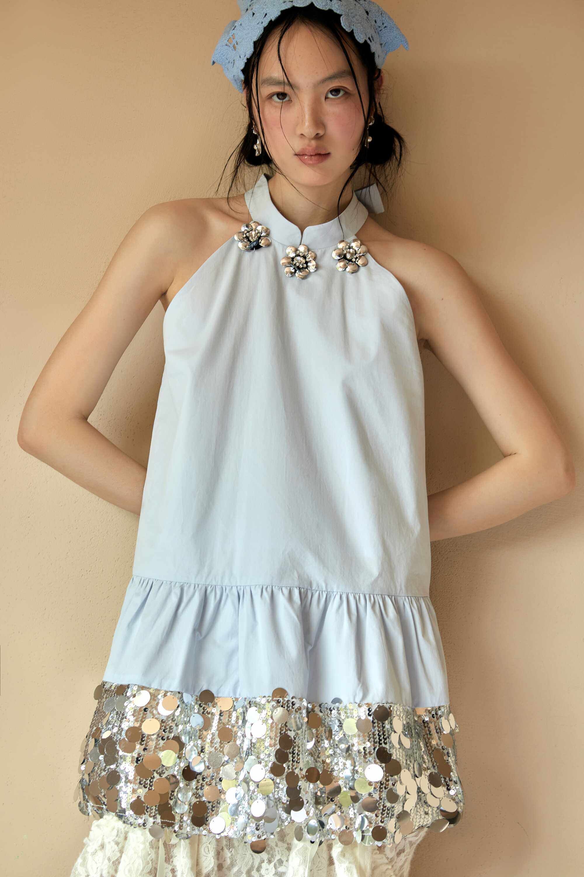 Shiitake【希林娜依·高同款】圣托里尼蓝色挂脖亮片花朵短连衣裙