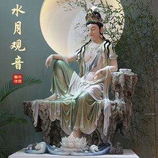 汉白玉水月自在观音菩萨佛像供奉佛堂手工彩绘自在观世音菩萨摆件